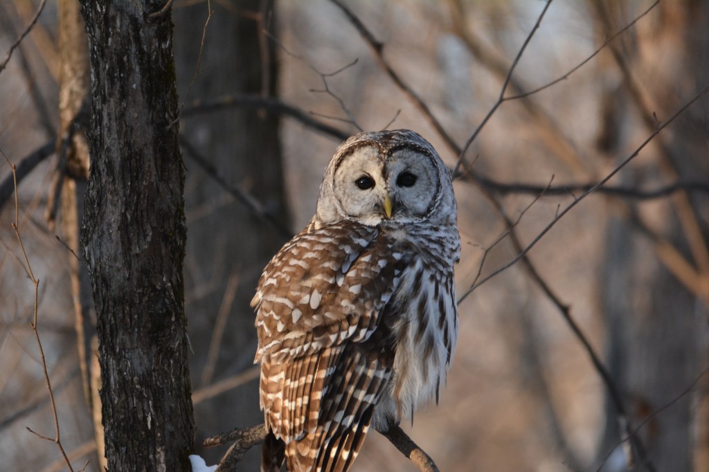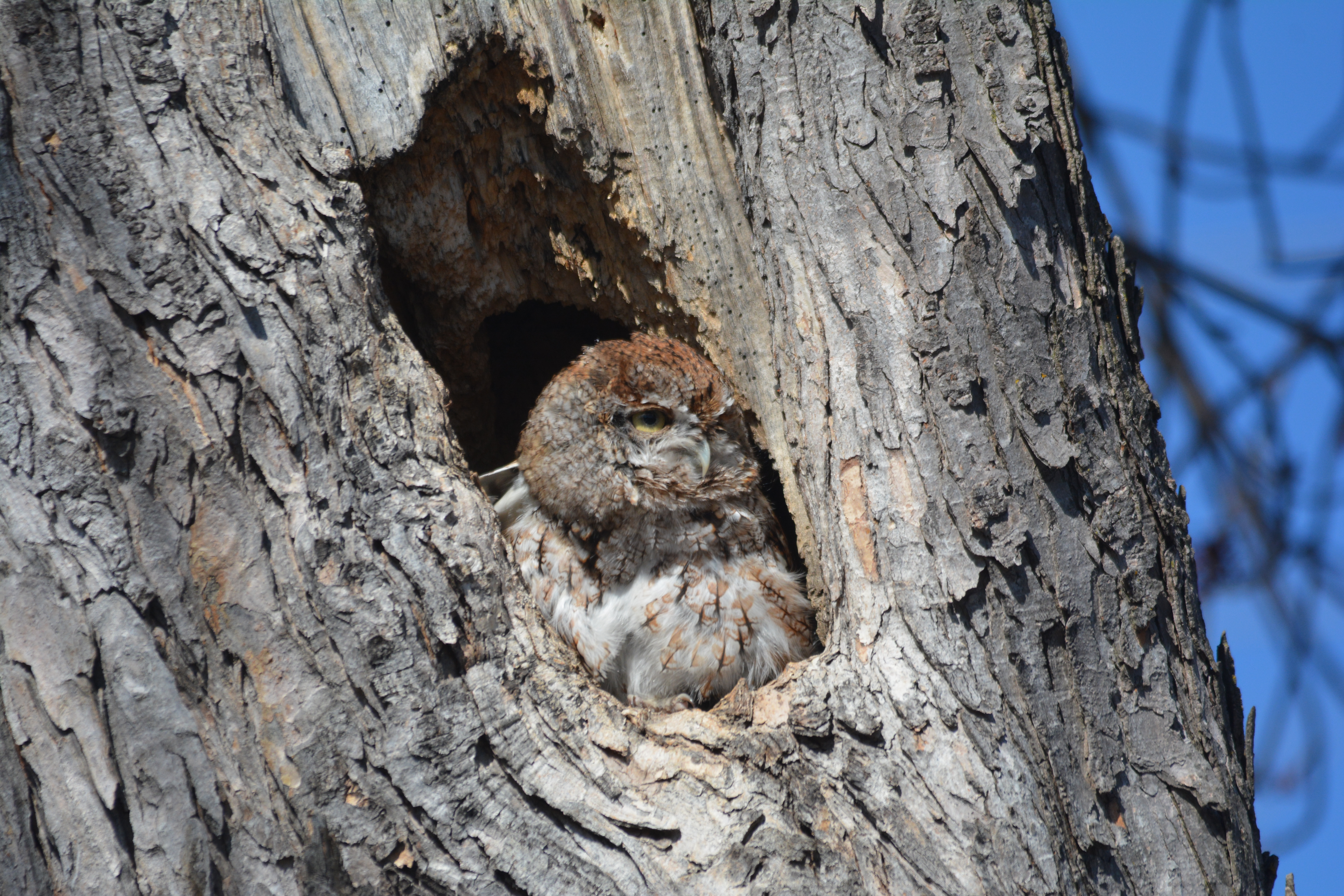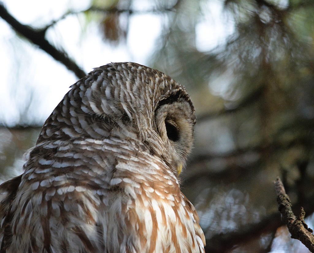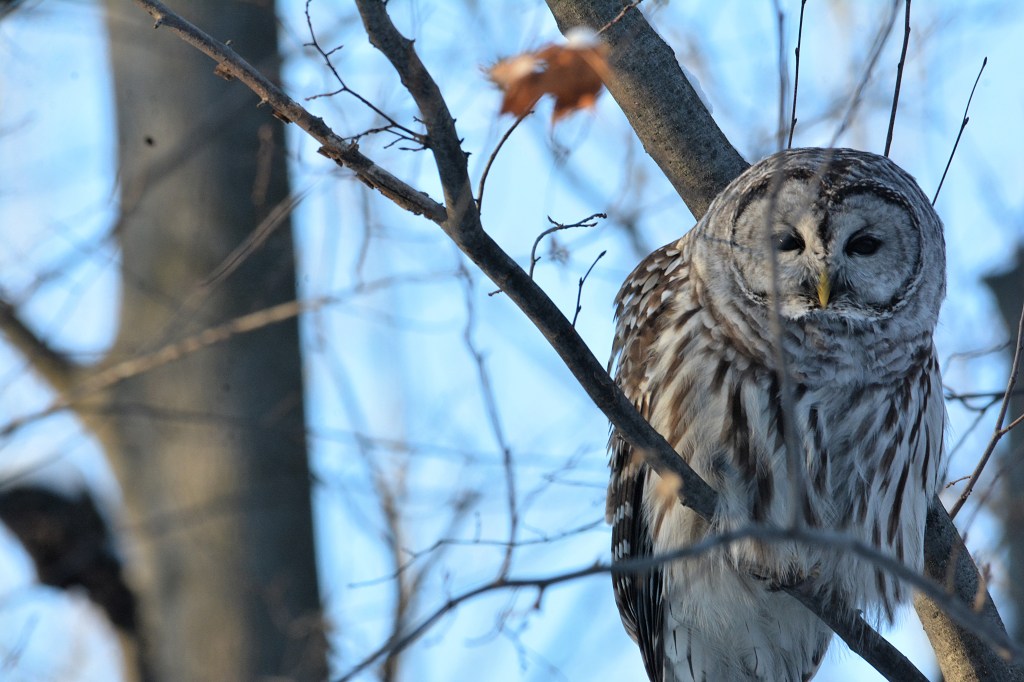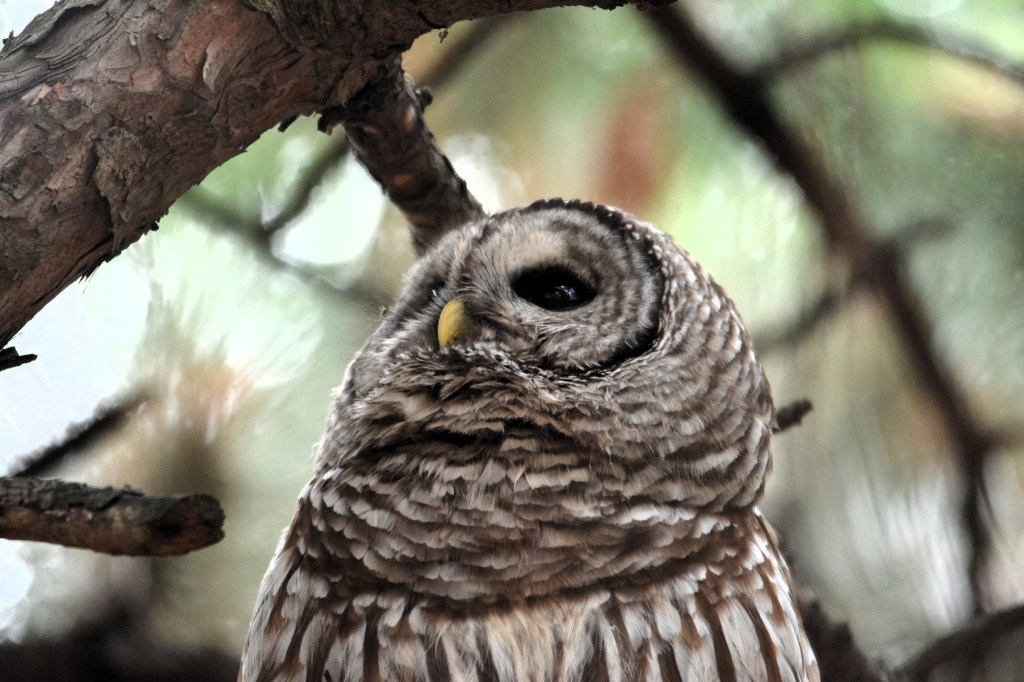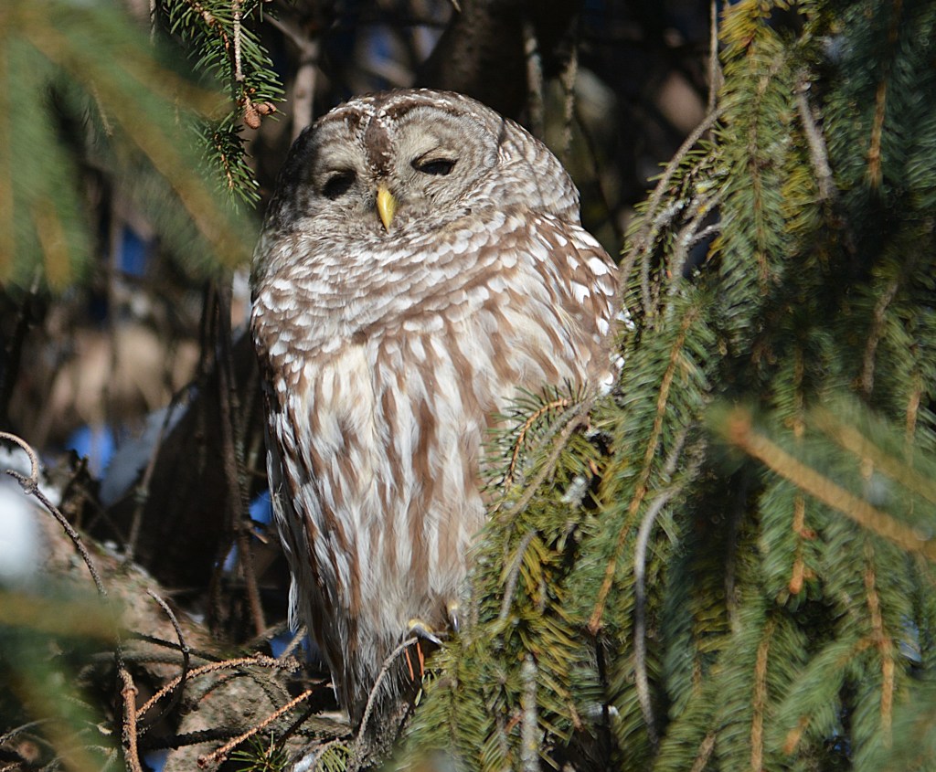 Je l’ai baptisé affectueusement le gardien du stationnement du parc Bernard-Landry à Laval. Ce petit hibou est trapu avec une grosse tête et sans cou. Sa couleur varie du gris au roux vif (brun-rougeâtre). Son motif complexe permet un parfait camouflage sur fond d’écorce d’arbre. Yeux jaunes. Il est actif la nuit alors qu’il chasse les petits oiseaux et les mammifères. Il se repose et niche dans des cavités.