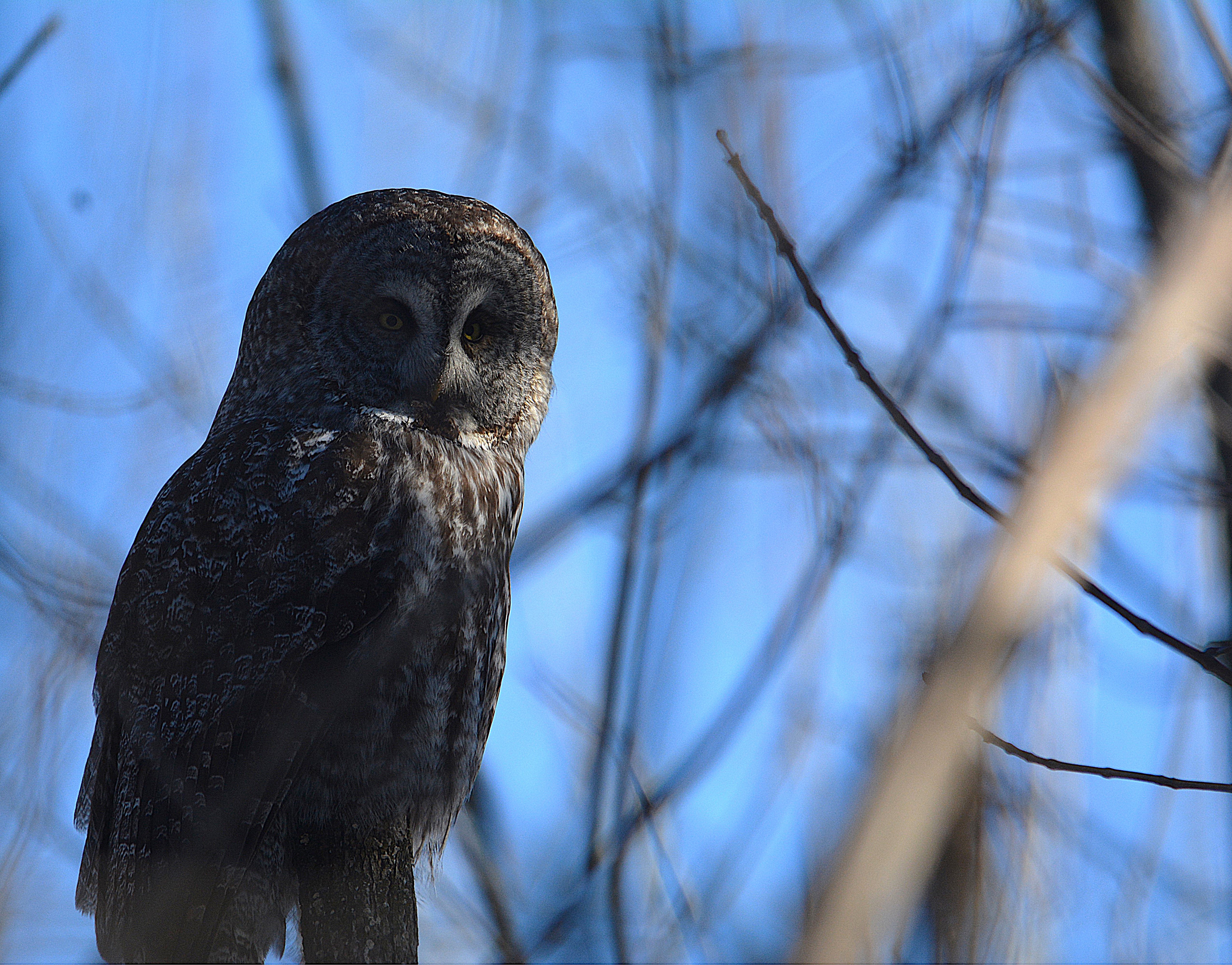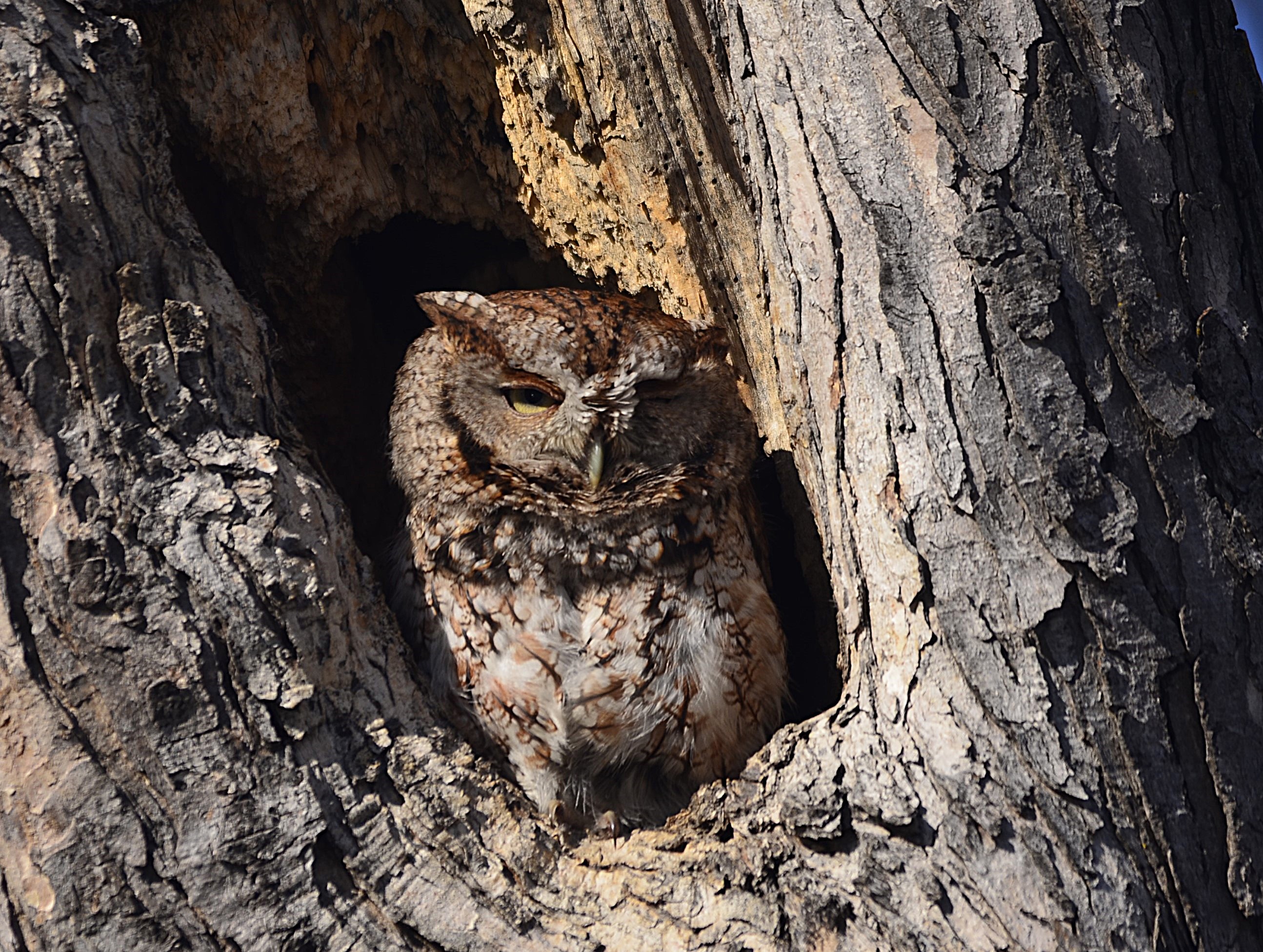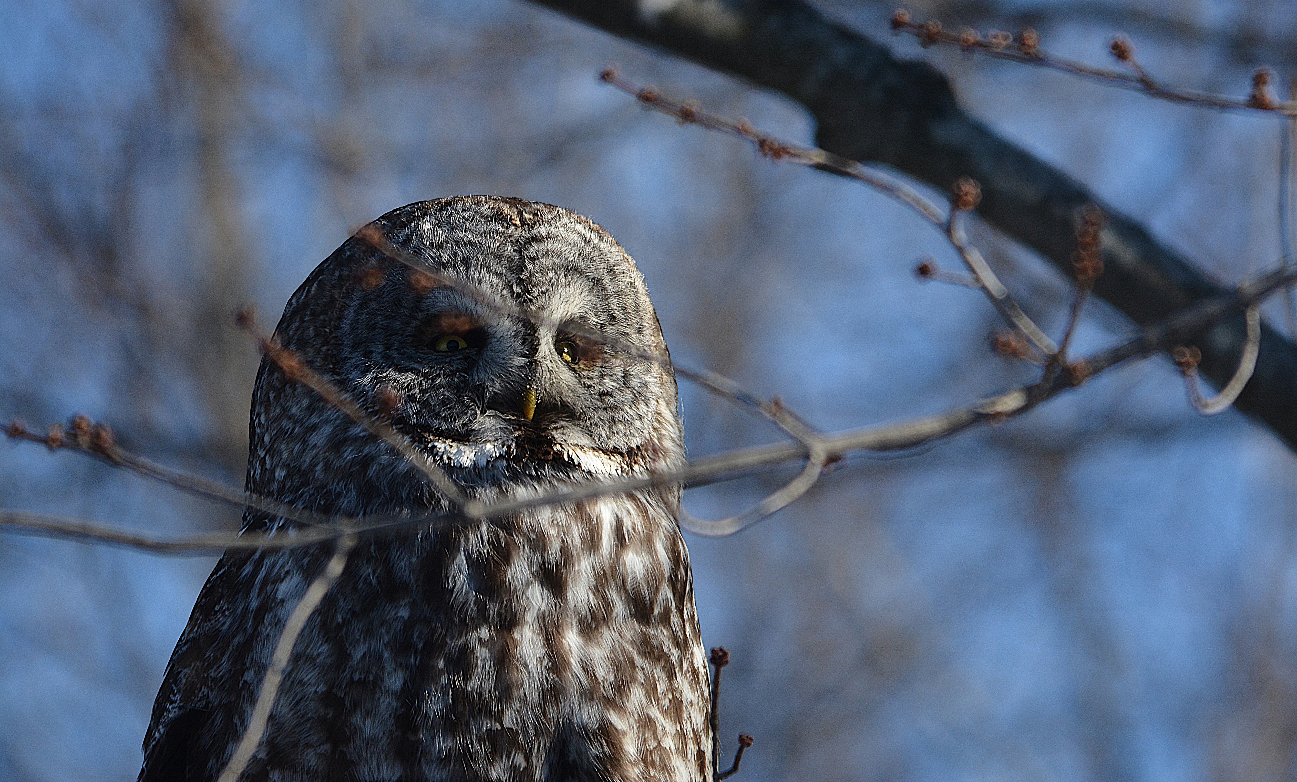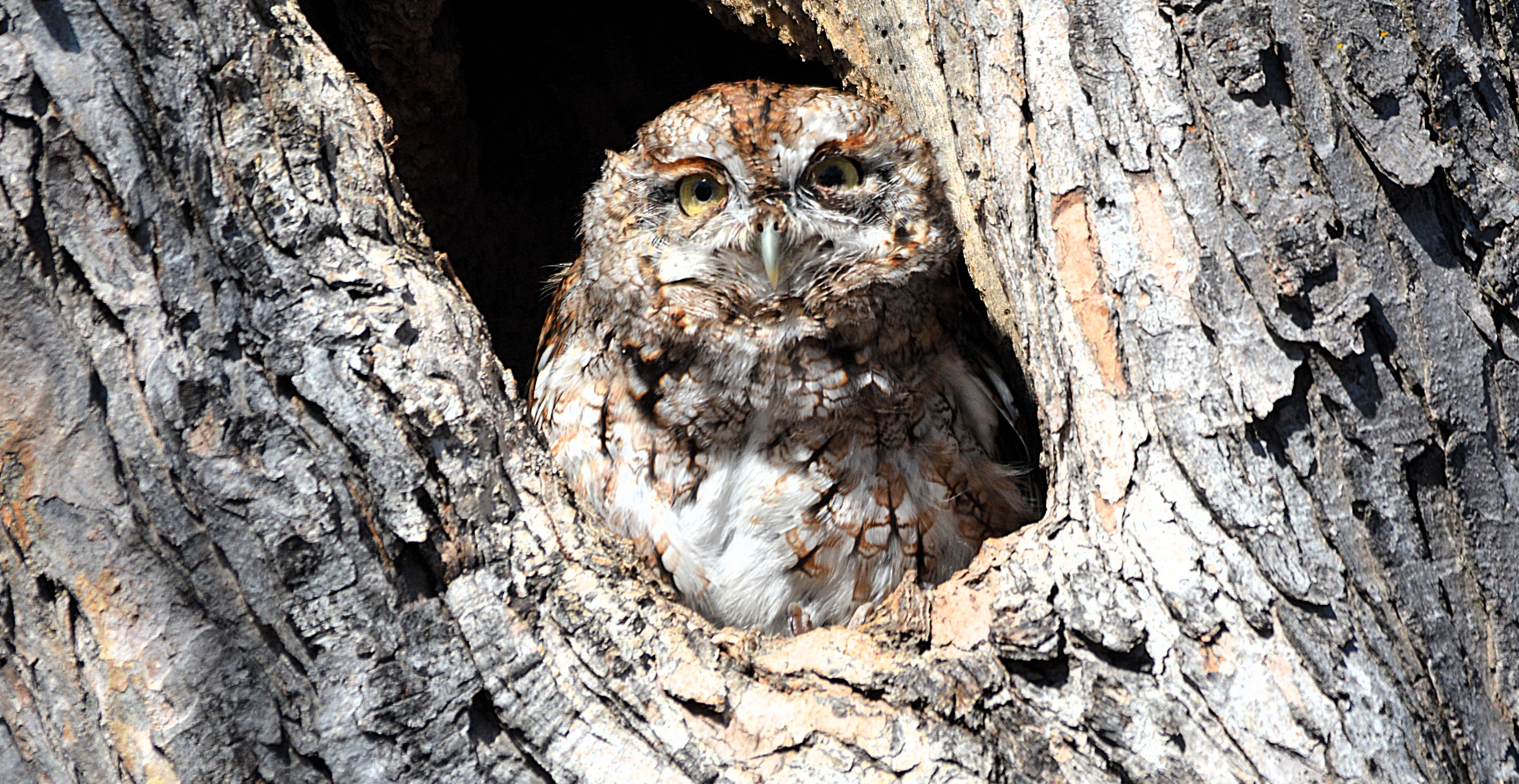 Je l’ai baptisé affectueusement le gardien du stationnement du parc Bernard-Landry à Laval. Ce petit hibou est trapu avec une grosse tête et sans cou. Sa couleur varie du gris au roux vif (brun-rougeâtre). Son motif complexe permet un parfait camouflage sur fond d’écorce d’arbre. Yeux jaunes. Il est actif la nuit alors qu’il chasse les petits oiseaux et les mammifères. Il se repose et niche dans des cavités.
