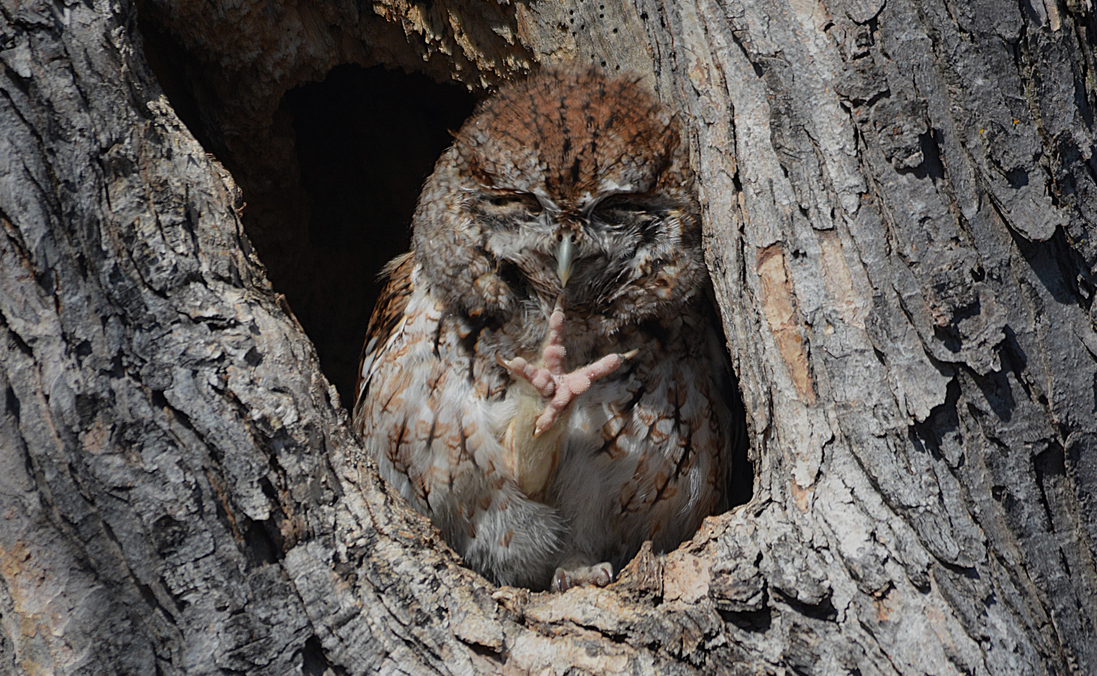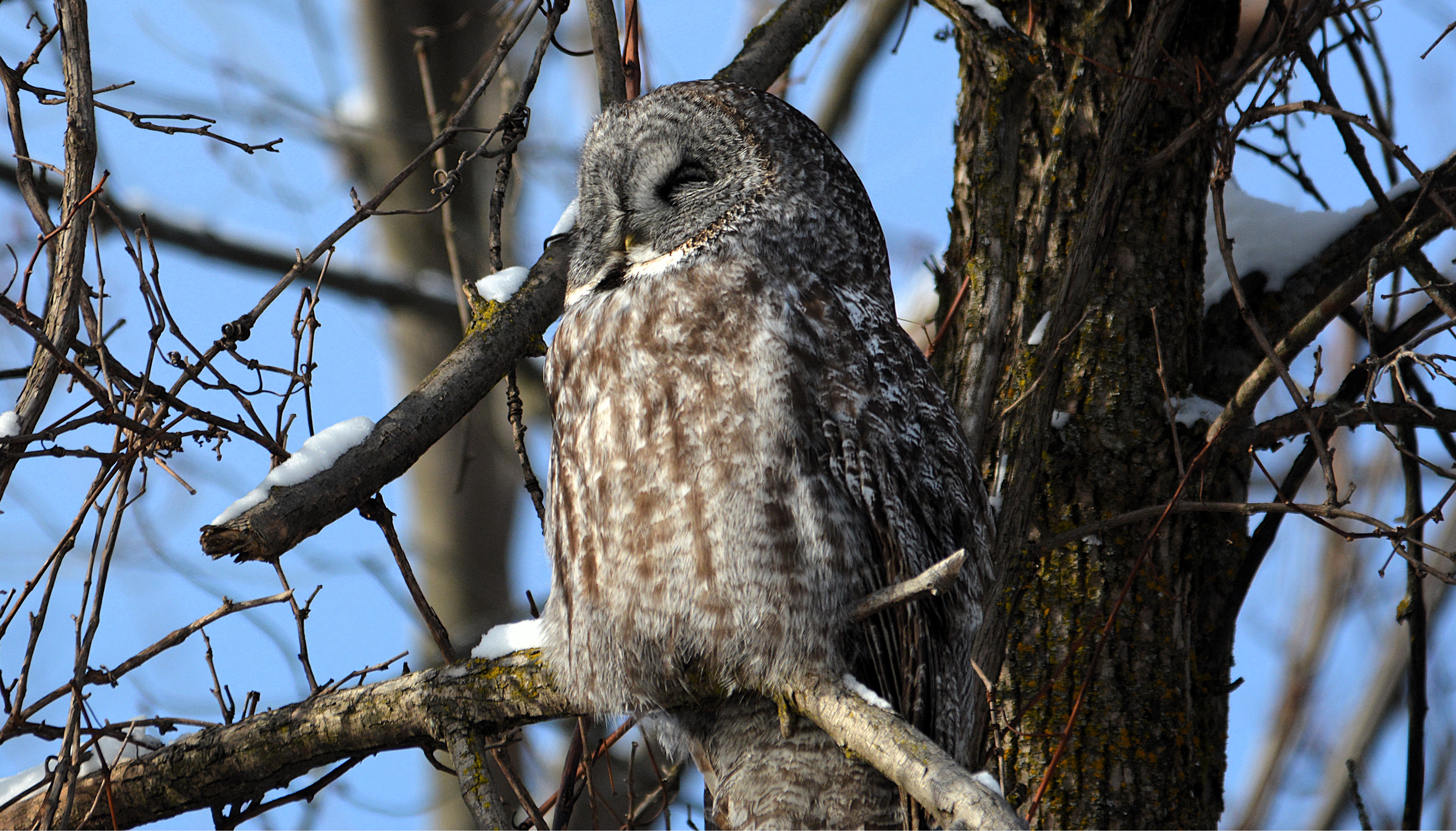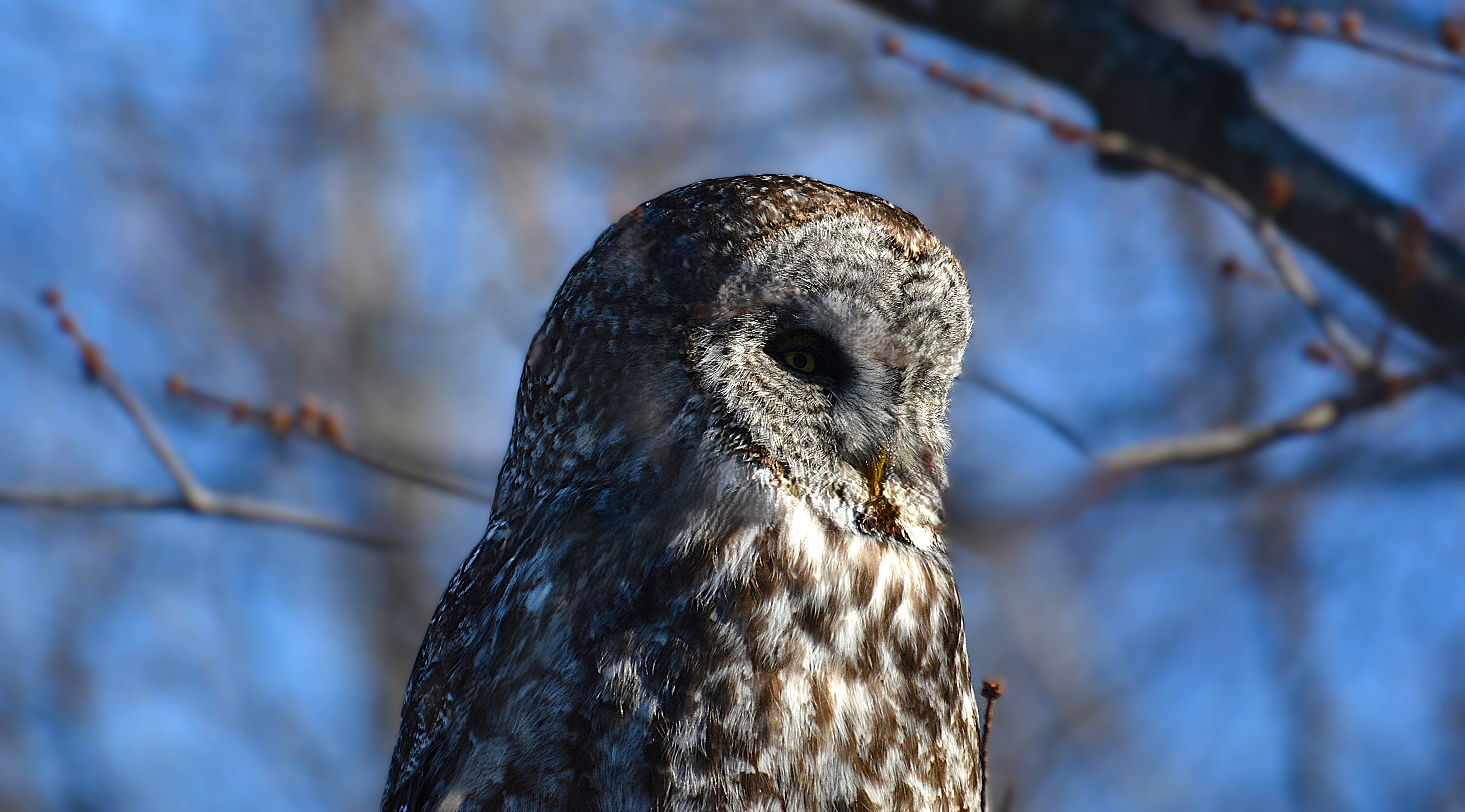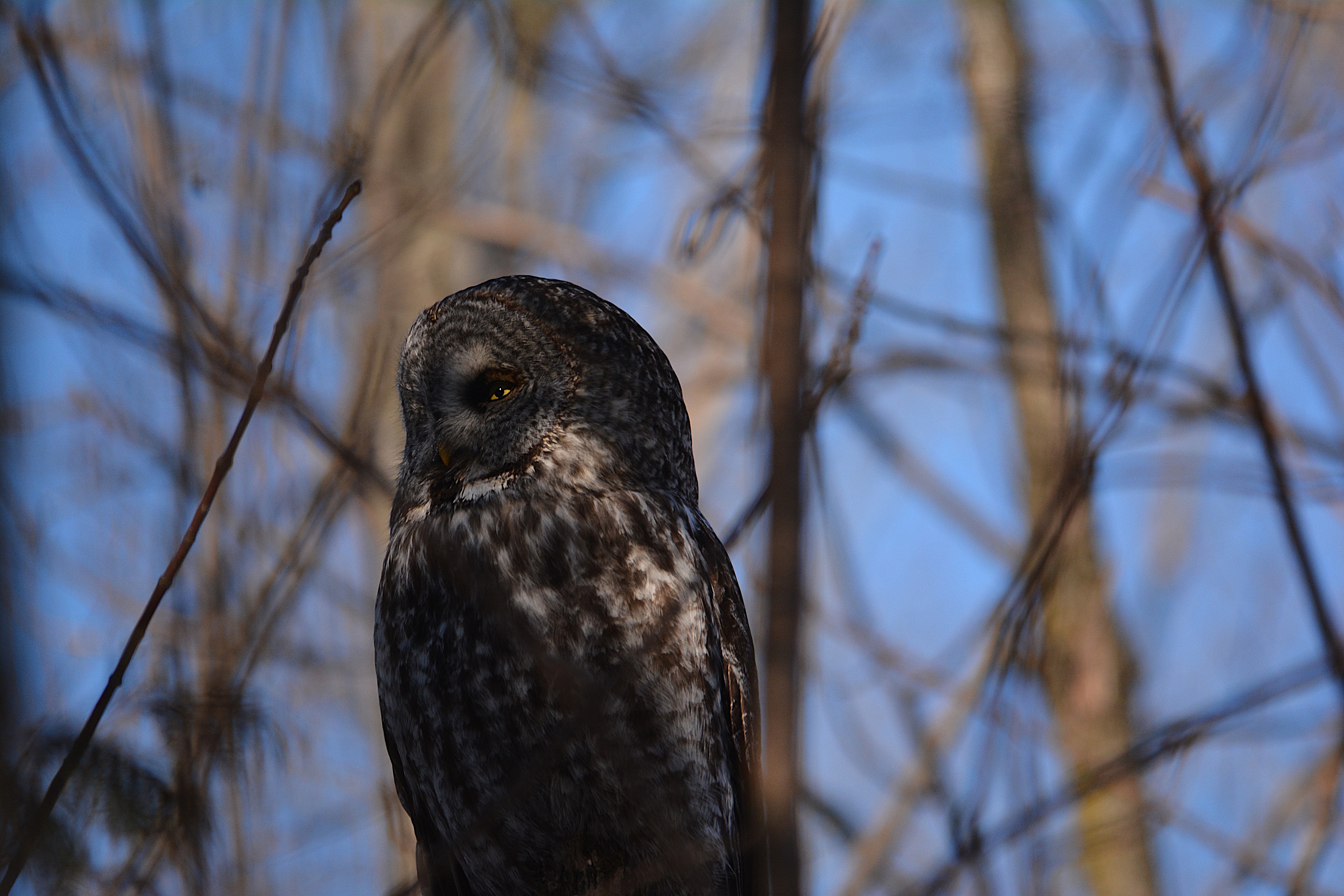 Je l’ai baptisé affectueusement le gardien du stationnement du parc Bernard-Landry à Laval. Ce petit hibou est trapu avec une grosse tête et sans cou. Sa couleur varie du gris au roux vif (brun-rougeâtre). Son motif complexe permet un parfait camouflage sur fond d’écorce d’arbre. Yeux jaunes. Il est actif la nuit alors qu’il chasse les petits oiseaux et les mammifères. Il se repose et niche dans des cavités.