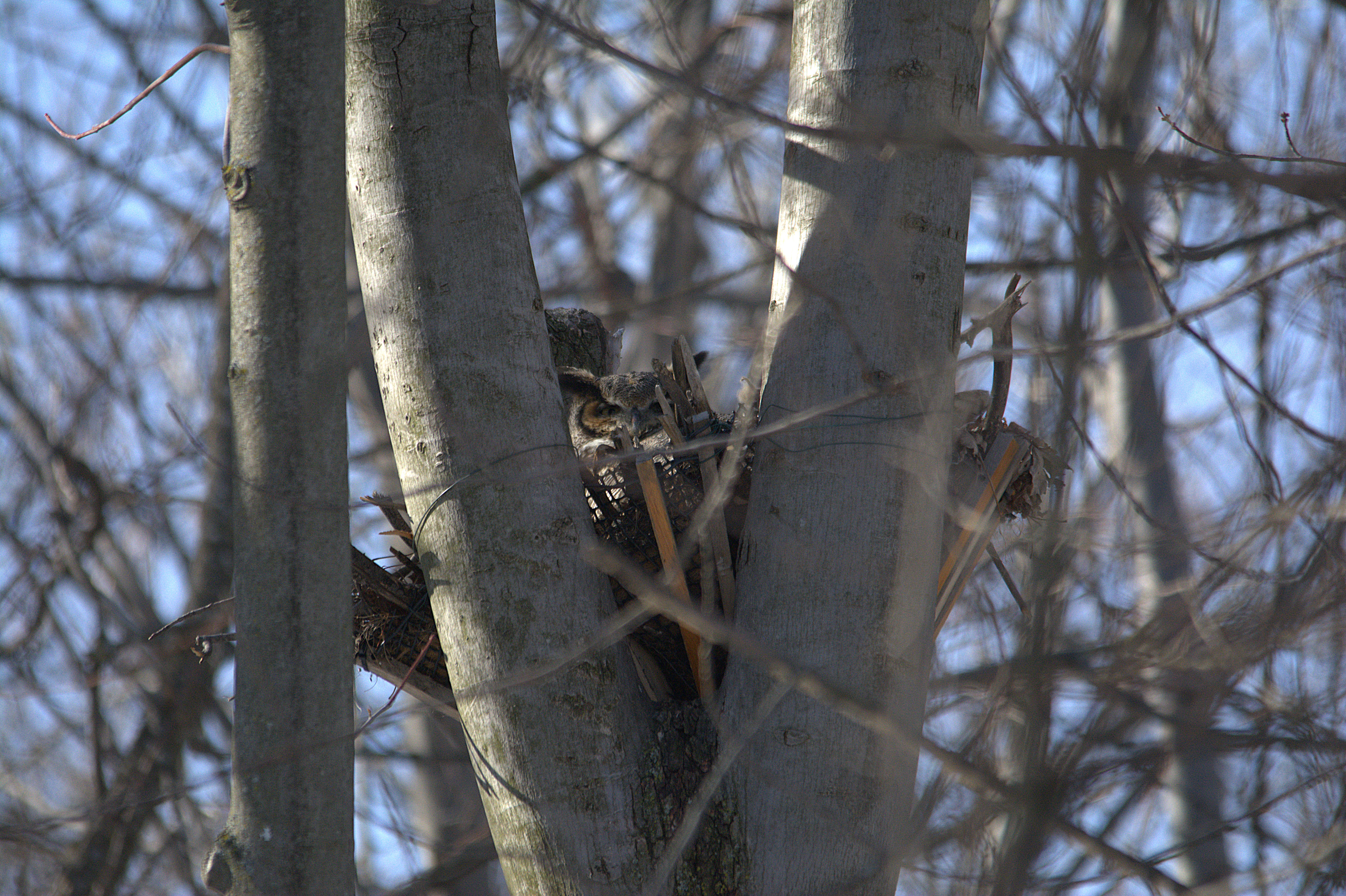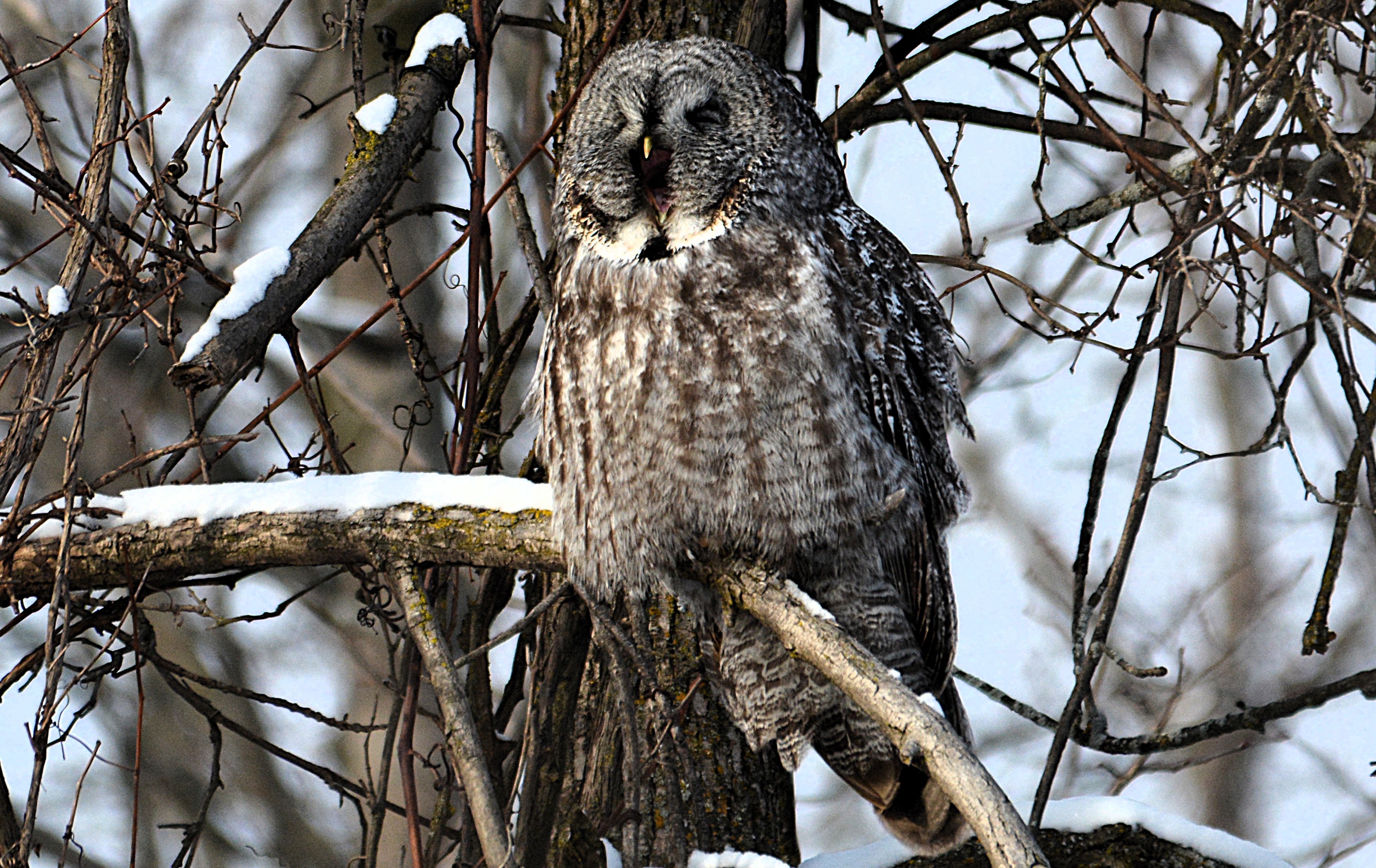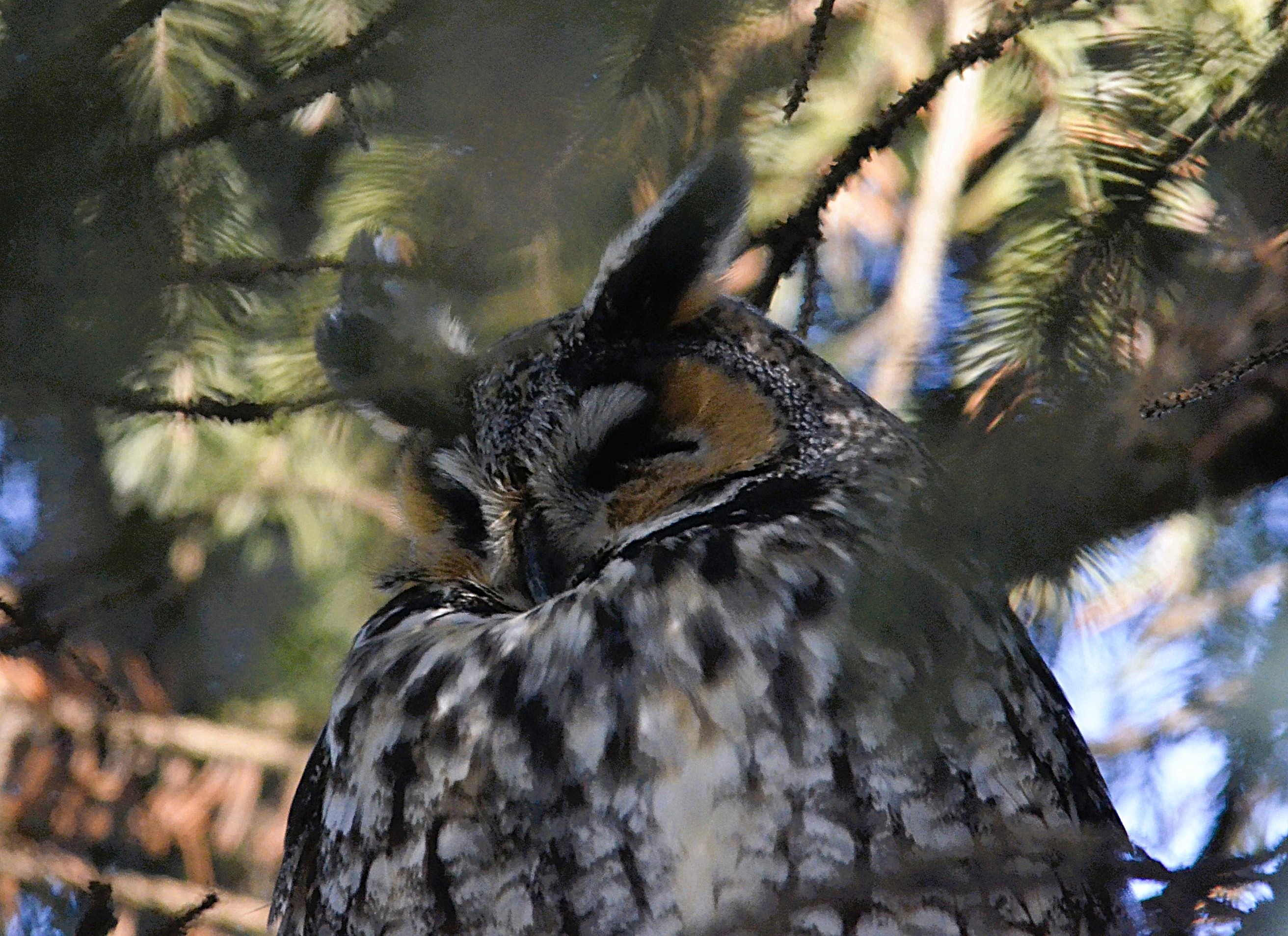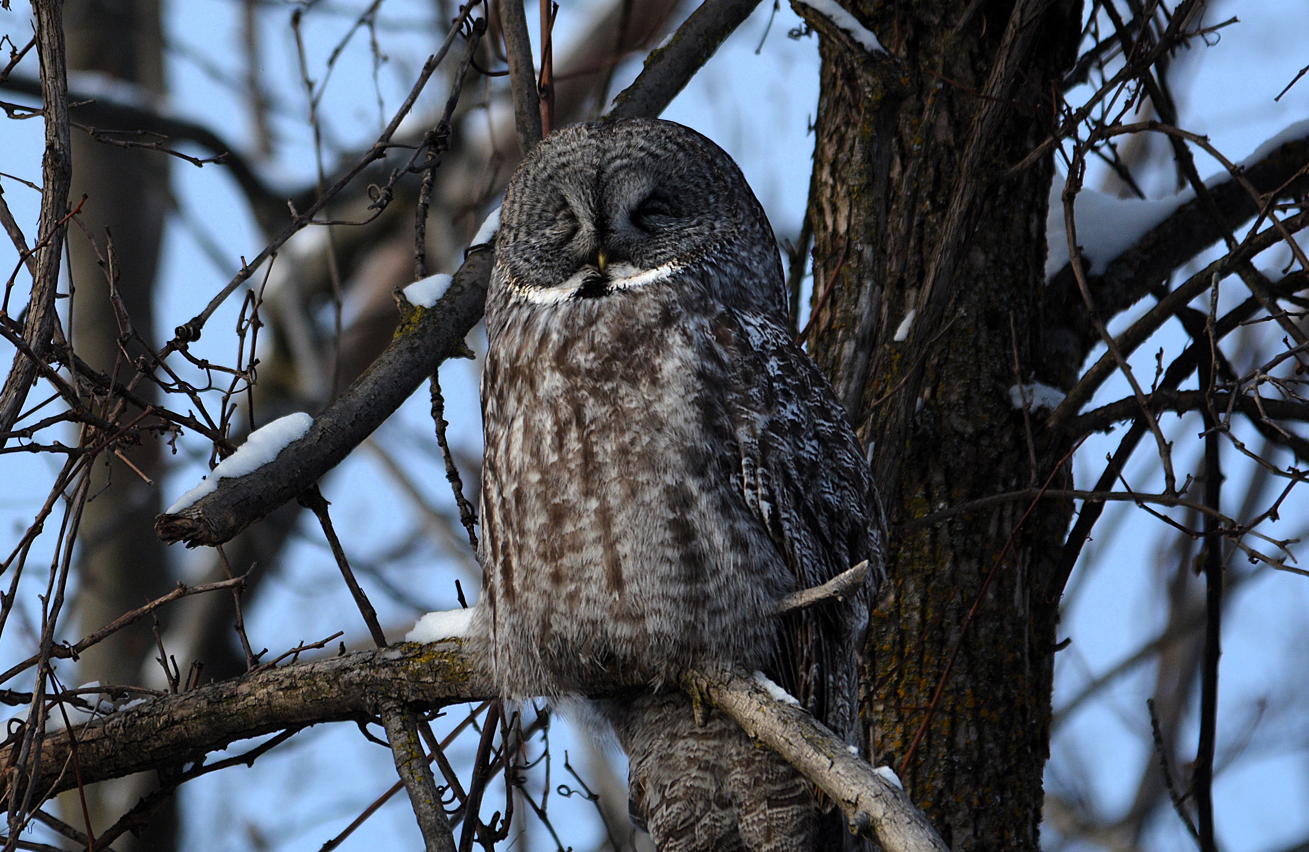 Je l’ai baptisé affectueusement le gardien du stationnement du parc Bernard-Landry à Laval. Ce petit hibou est trapu avec une grosse tête et sans cou. Sa couleur varie du gris au roux vif (brun-rougeâtre). Son motif complexe permet un parfait camouflage sur fond d’écorce d’arbre. Yeux jaunes. Il est actif la nuit alors qu’il chasse les petits oiseaux et les mammifères. Il se repose et niche dans des cavités.