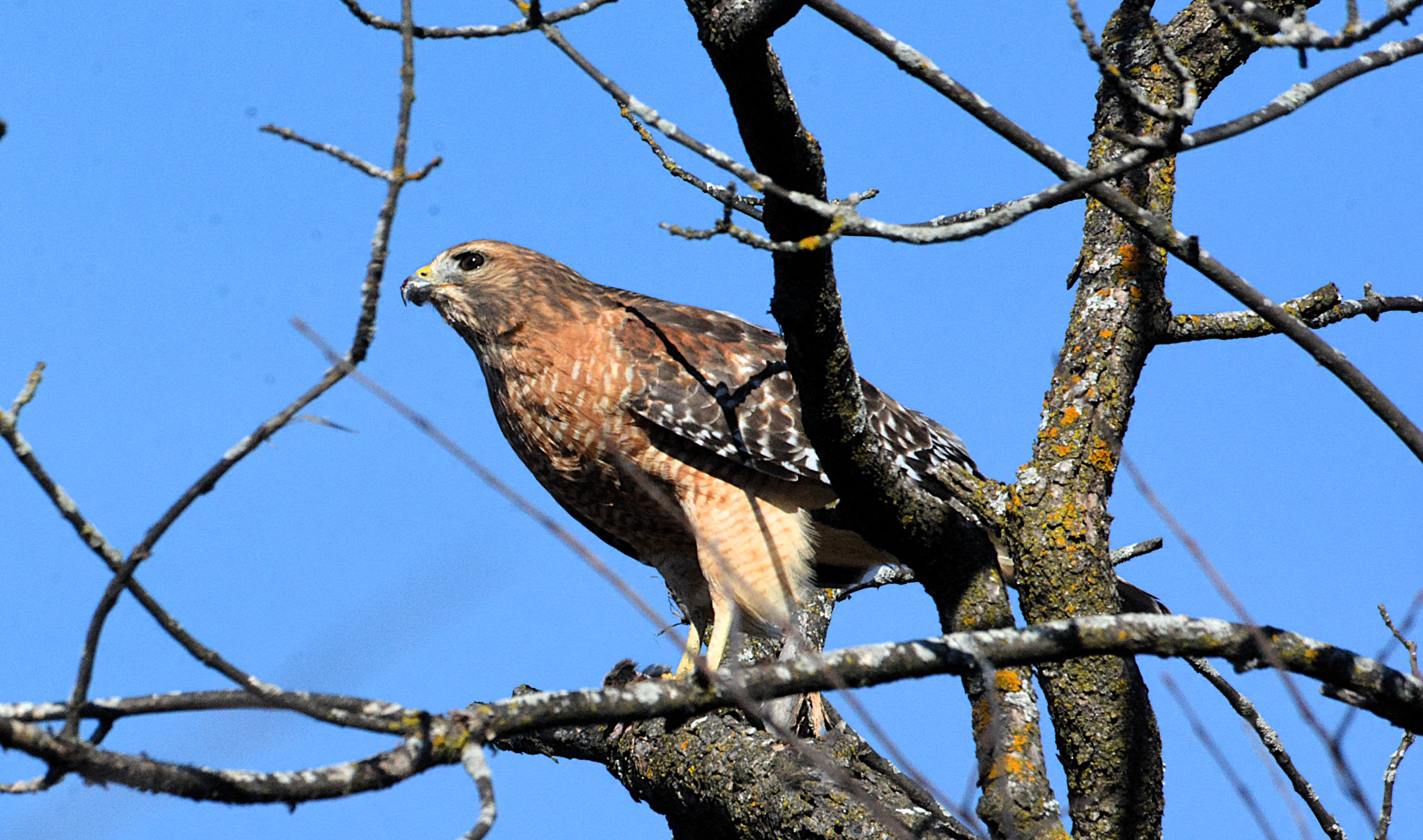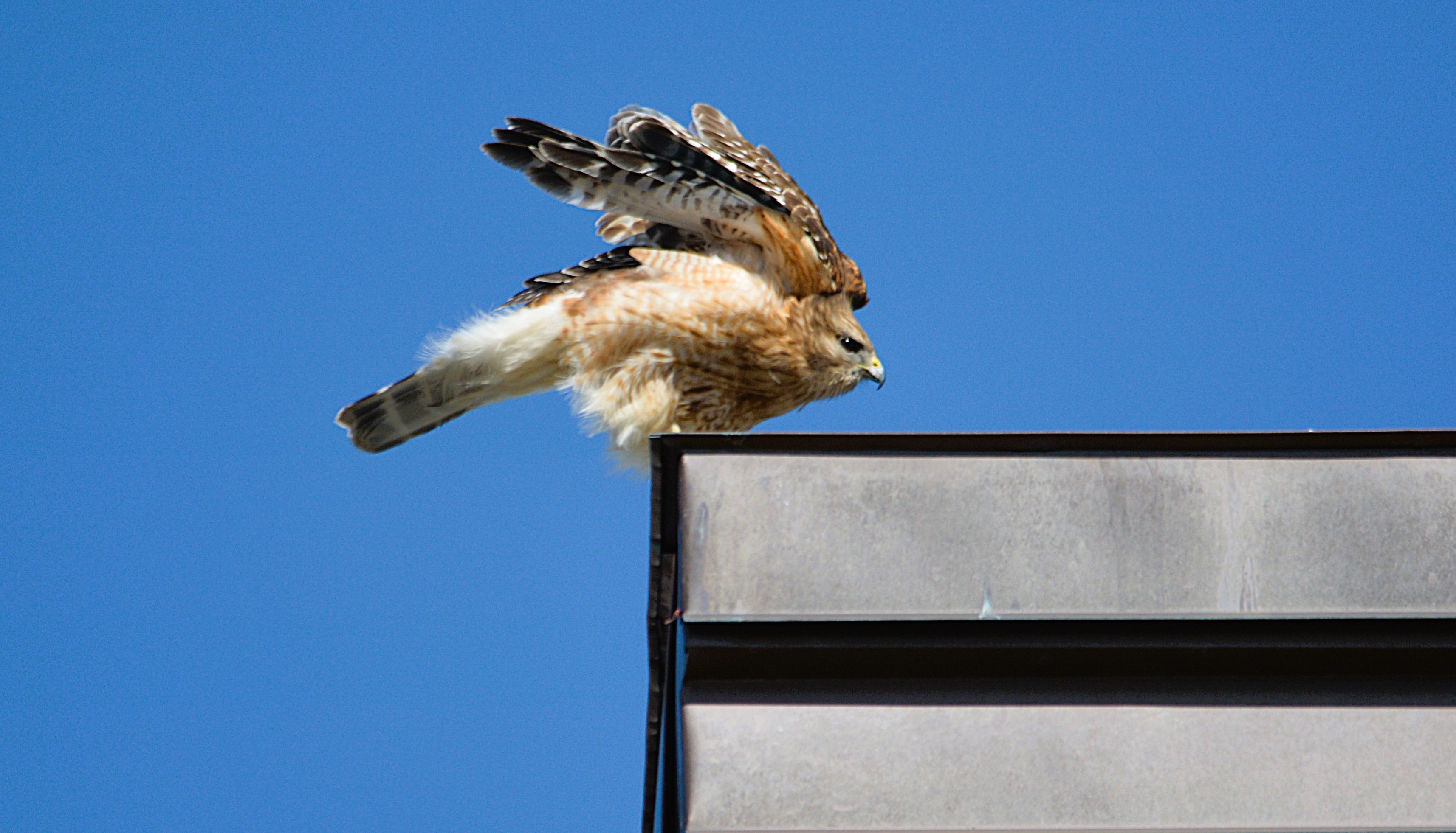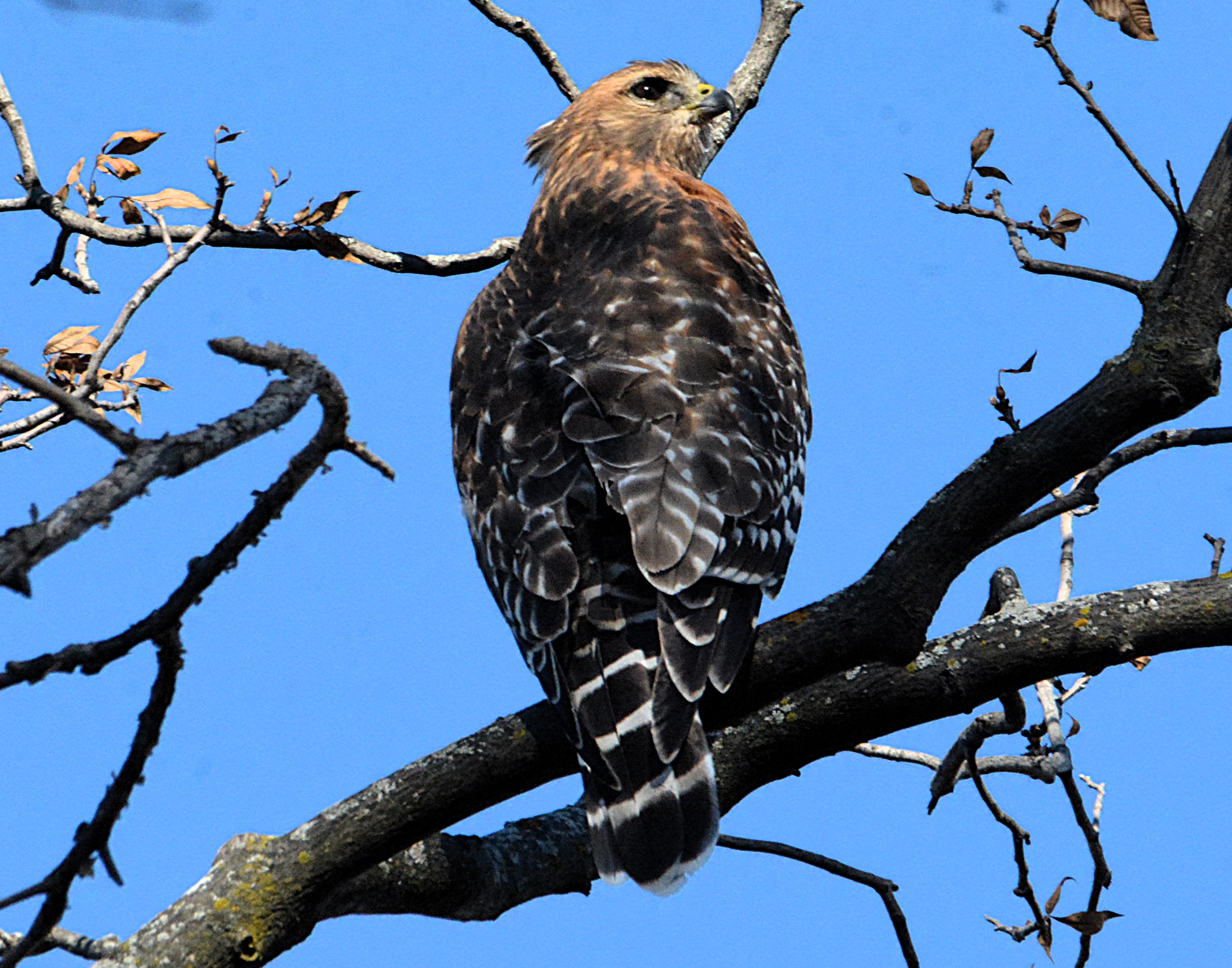Plus petite que la buse à queue rousse. Chez l’adulte, le dessous est barré d’orange vif. Les ailes sont marquées d’un damier noir et blanc bien net. Elle est souvent observée dans les zones forestières où elle chasse à partir de perchoirs.