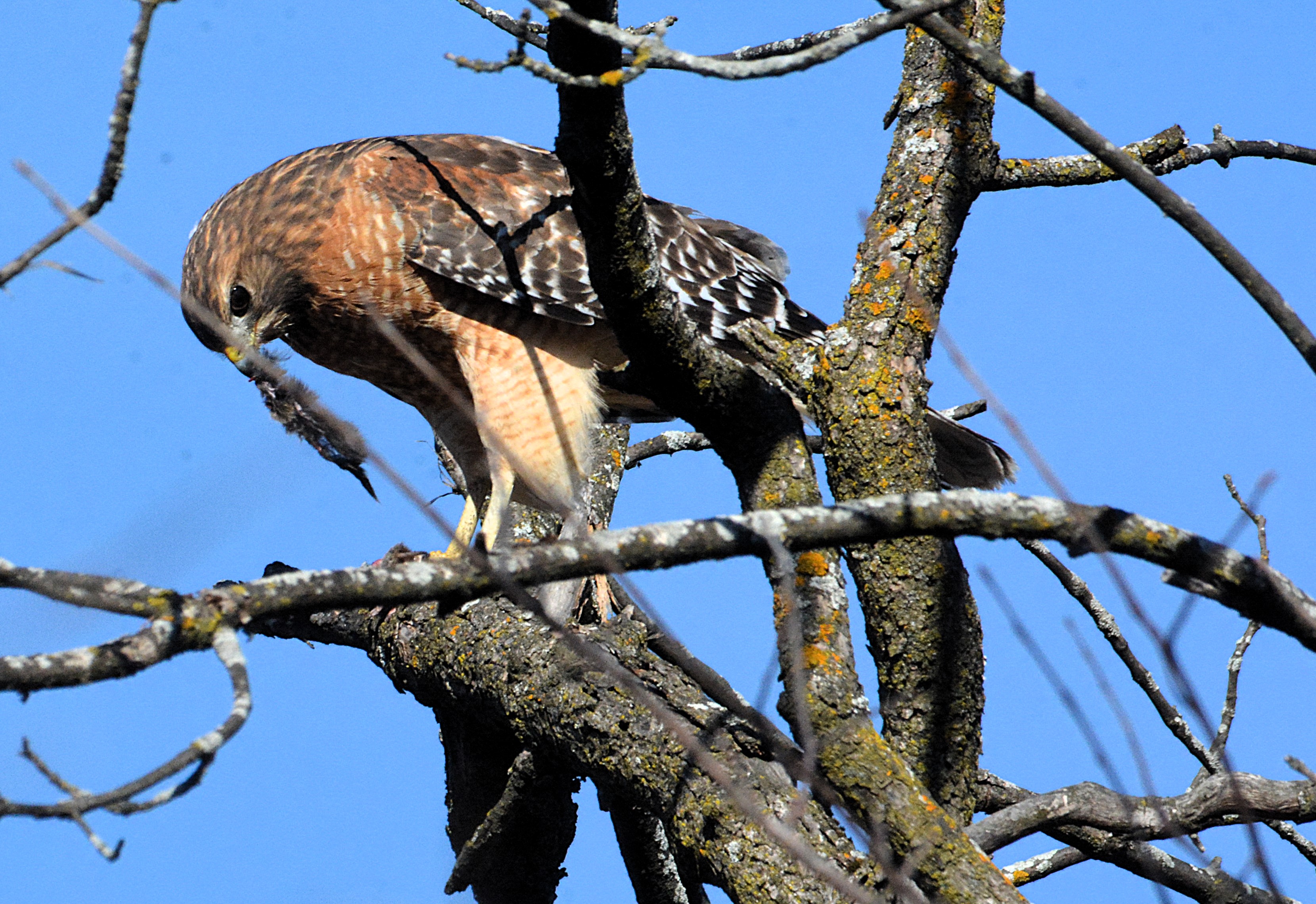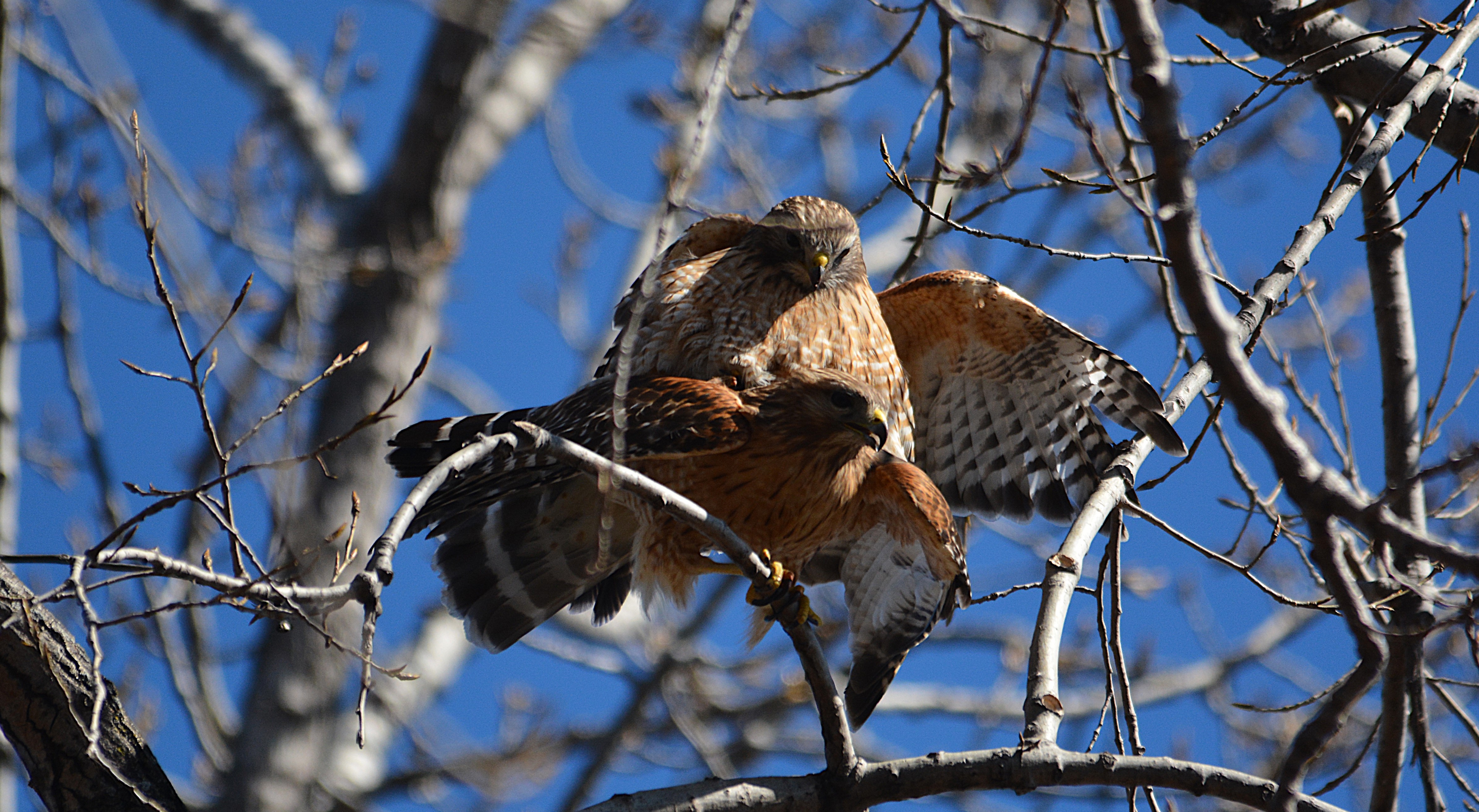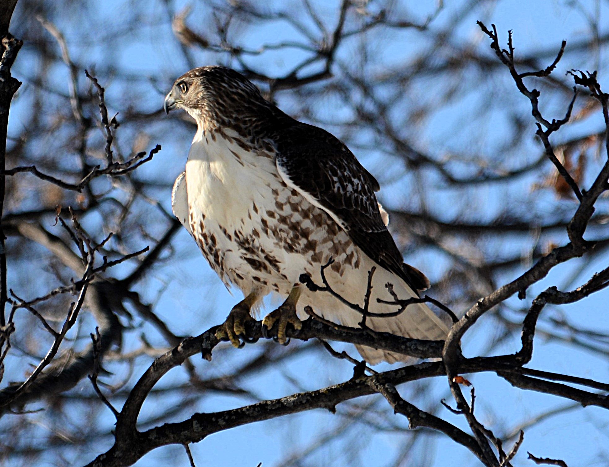Plus petite que la buse à queue rousse. Chez l’adulte, le dessous est barré d’orange vif. Les ailes sont marquées d’un damier noir et blanc bien net. Elle est souvent observée dans les zones forestières où elle chasse à partir de perchoirs.