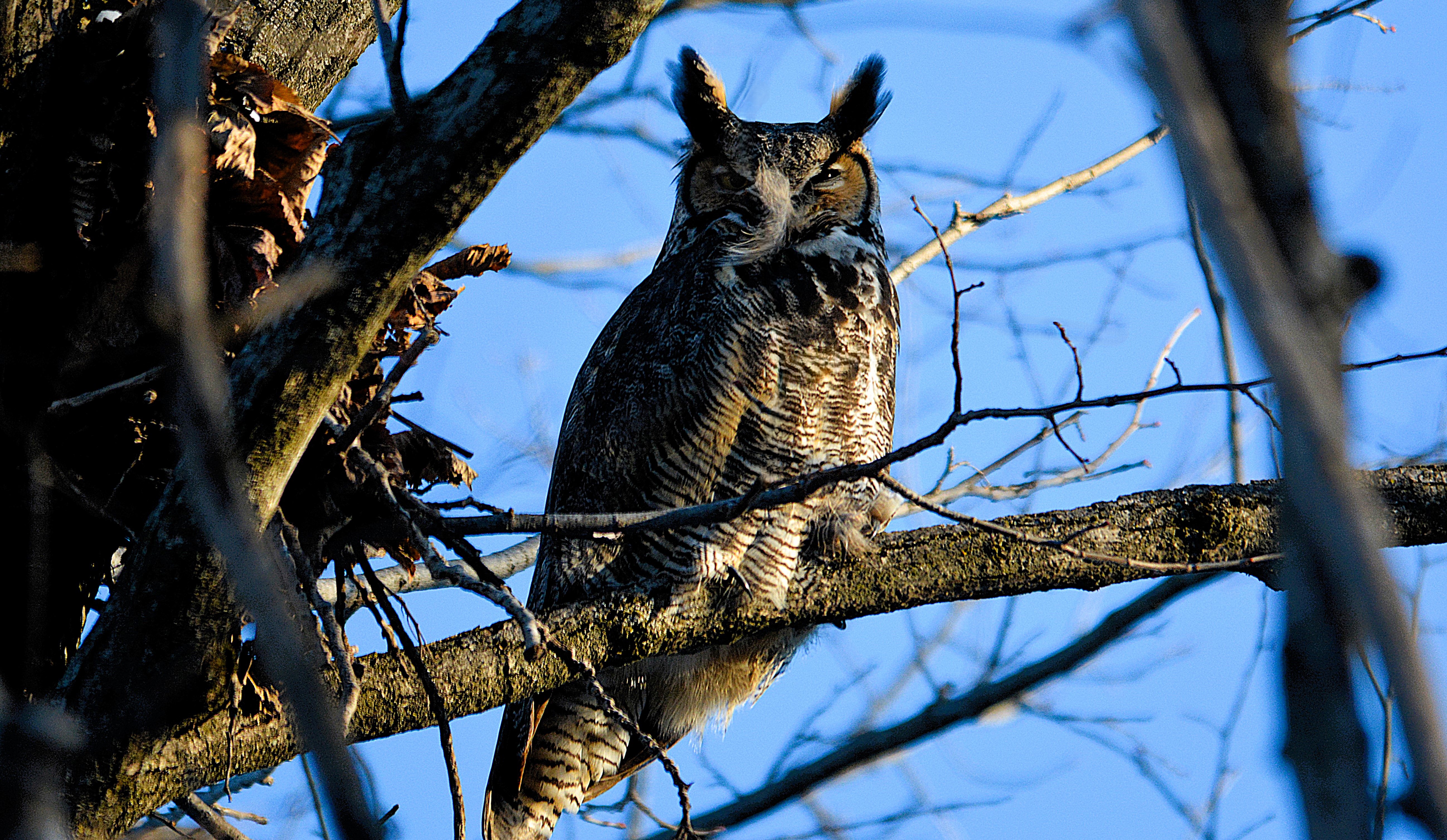 Grand hibou. S’observe dans divers habitats. Il fréquente aussi les petites villes et les banlieues avec des massifs d’arbres. Généralement un plumage foncé, mais de couleur variable. Il se nourrit de divers animaux dont des mammifères, des oiseaux et des reptiles.