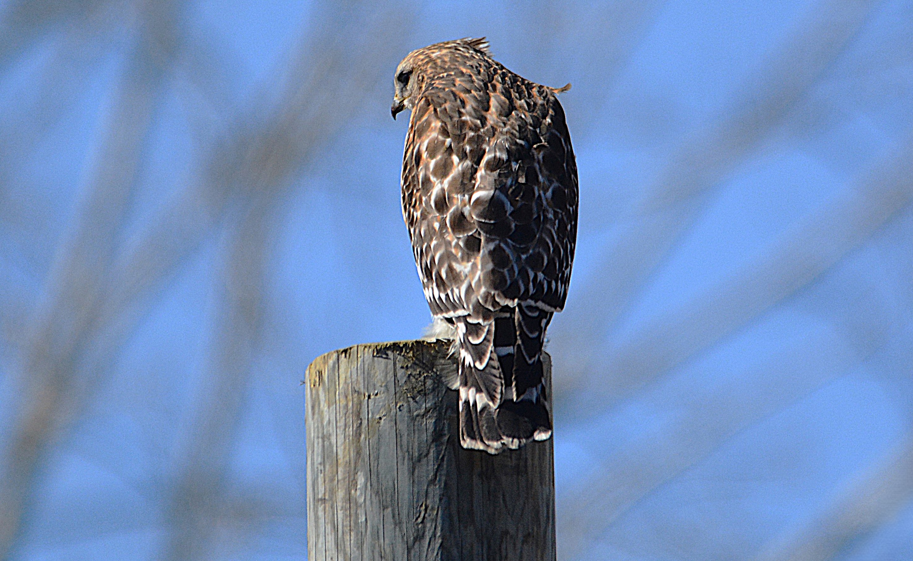 Se perche souvent au sommet des poteaux téléphoniques, des lampadaires et les points surélevés comme les grands arbres. Plumage extrêmement variable avec plusieurs différences régionales. Chez les adultes de l’Est le dessous est clair avec le ventre traversé de marques foncées. Elle plane et ne bat quasiment pas les ailes.