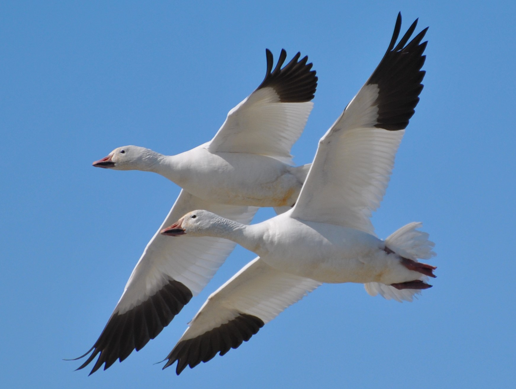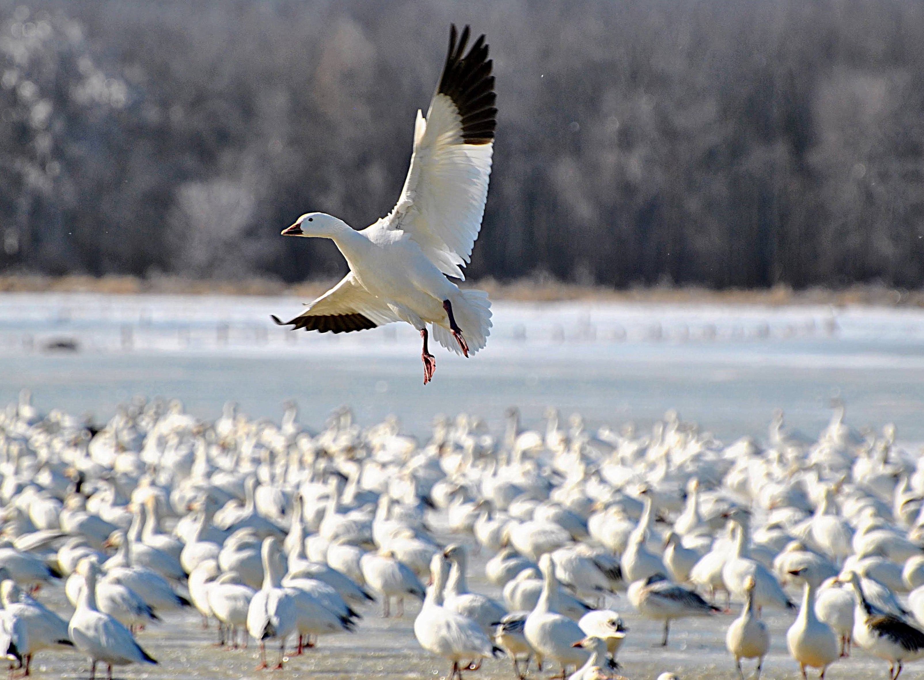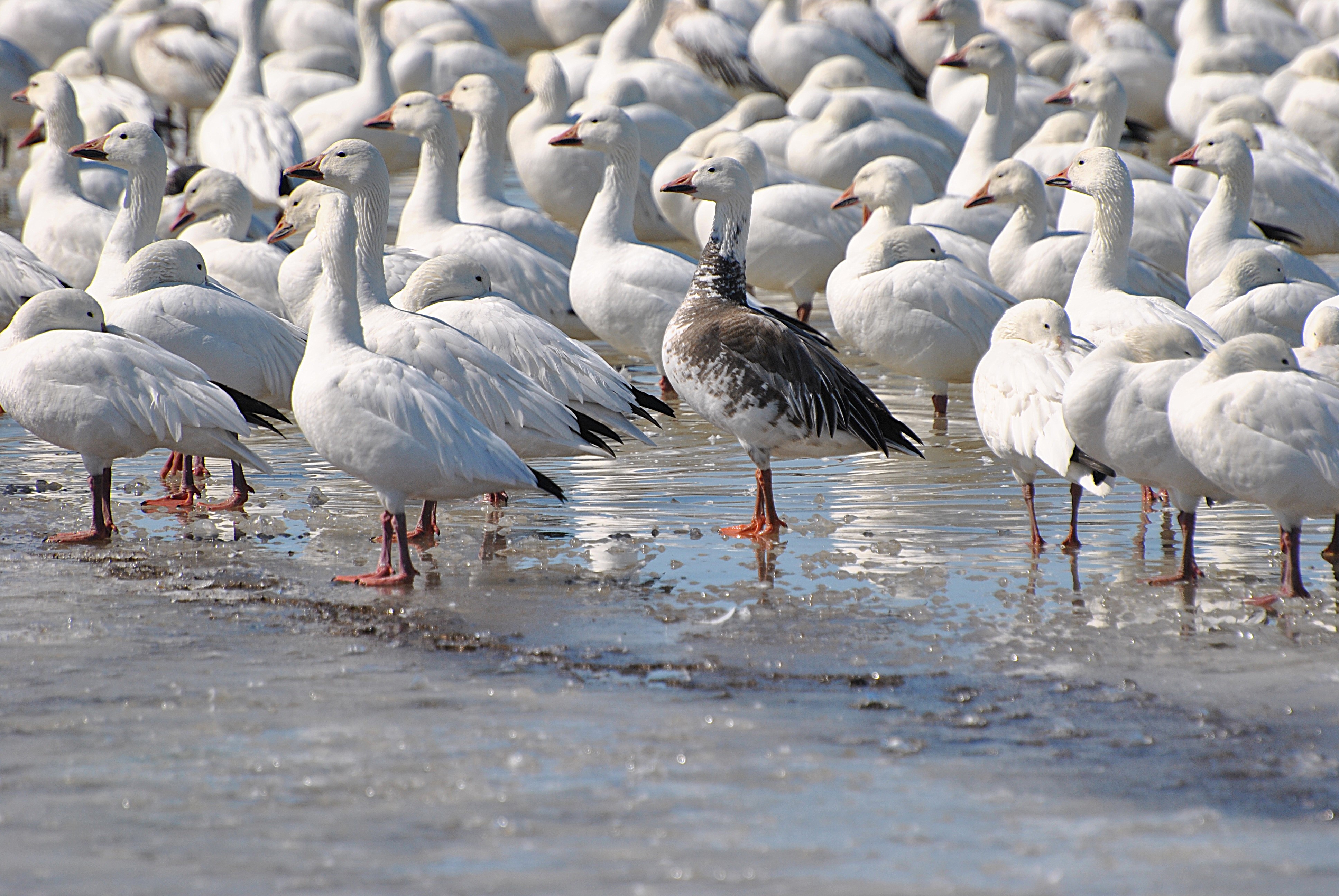 Tout blanc avec les pointes des ailes noires. On les voit se déplacer par milliers le printemps et l’automne. Baie-du-Febvre au printemps est un bon endroit pour l’observation. Il en est de même l’automne à la réserve nationale de faune du Cap-Tourmente de même qu’entre Montmagny et Saint-Jean-Port-Joli et au parc du réservoir Baudet à Victoriaville.