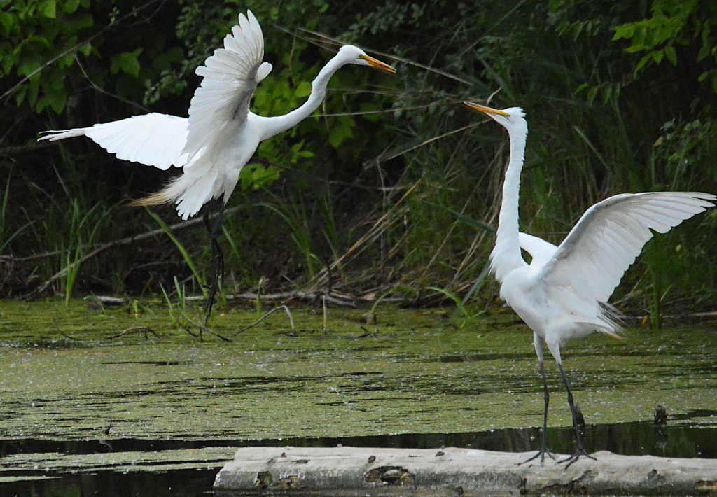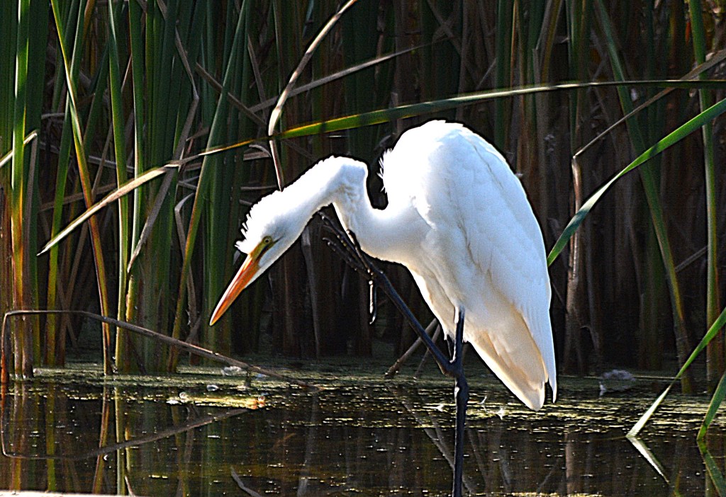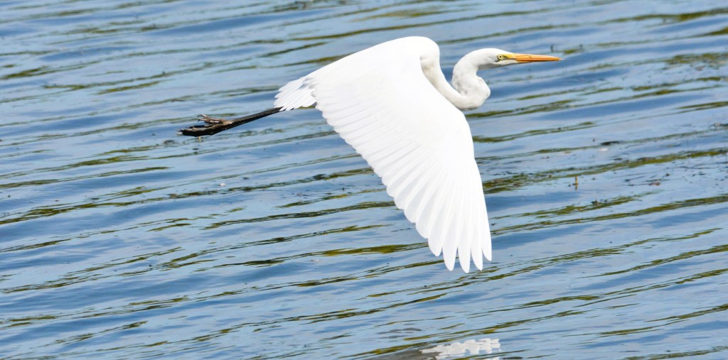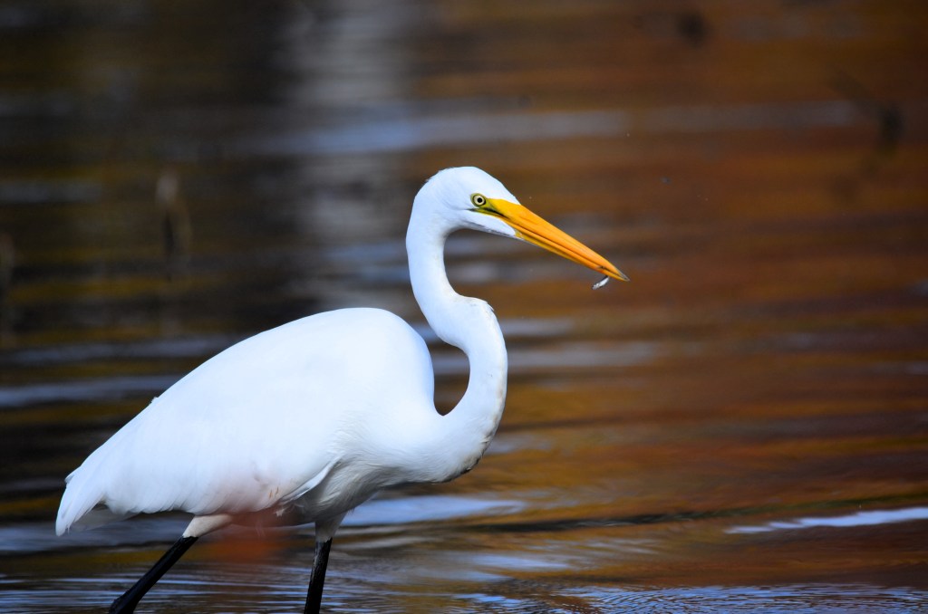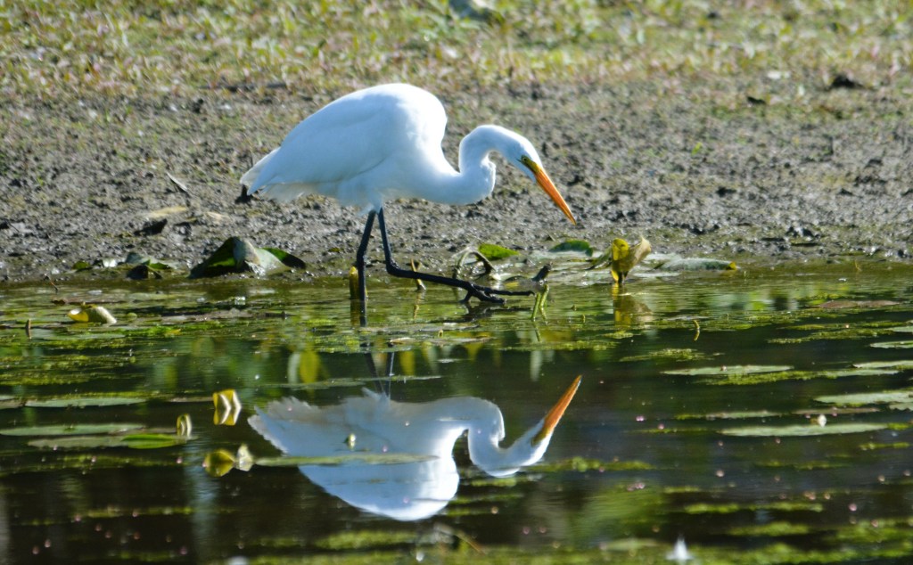 D’un blanc immaculé son plumage se découpe à l’horizon. Ce grand héron blanc se nourrit dans les zones humides et peu profondes. Il niche souvent en colonies nombreuses, fréquemment en compagnie d’autres espèces. On le voit souvent en compagnie d’un grand héron en train de pêcher à courte distance l’un de l’autre.