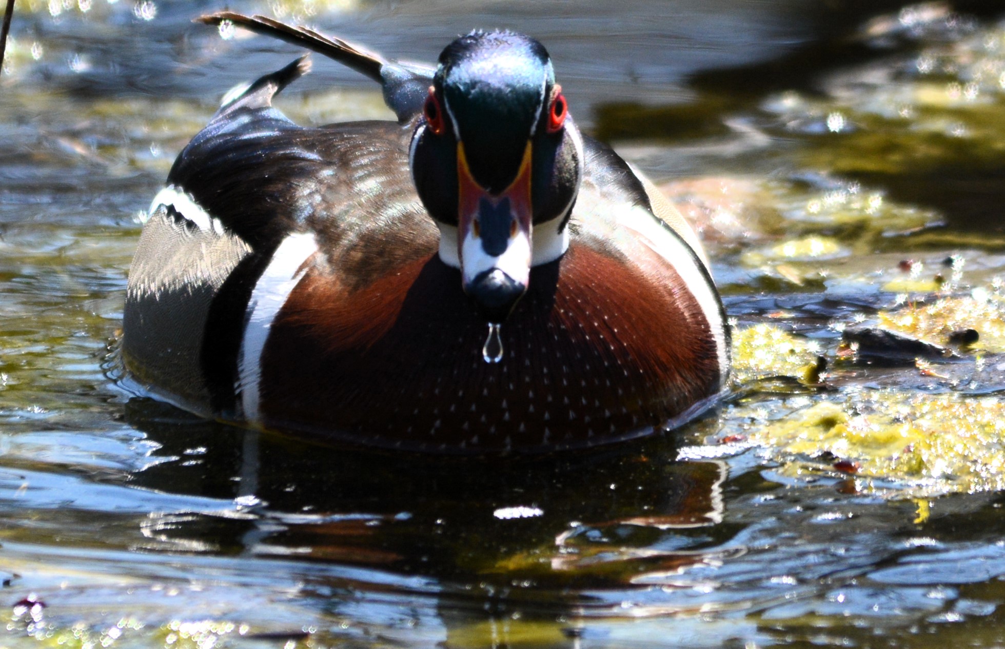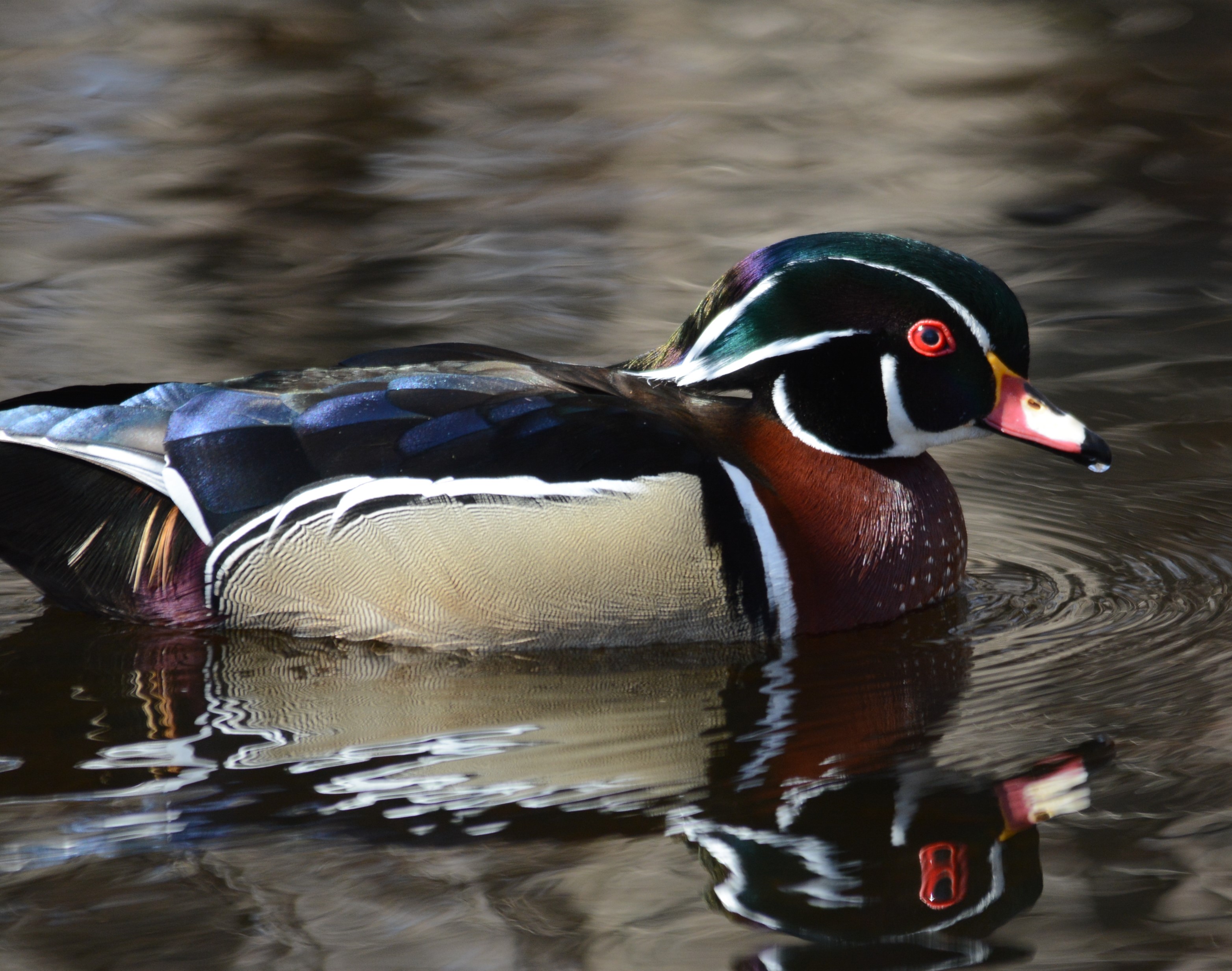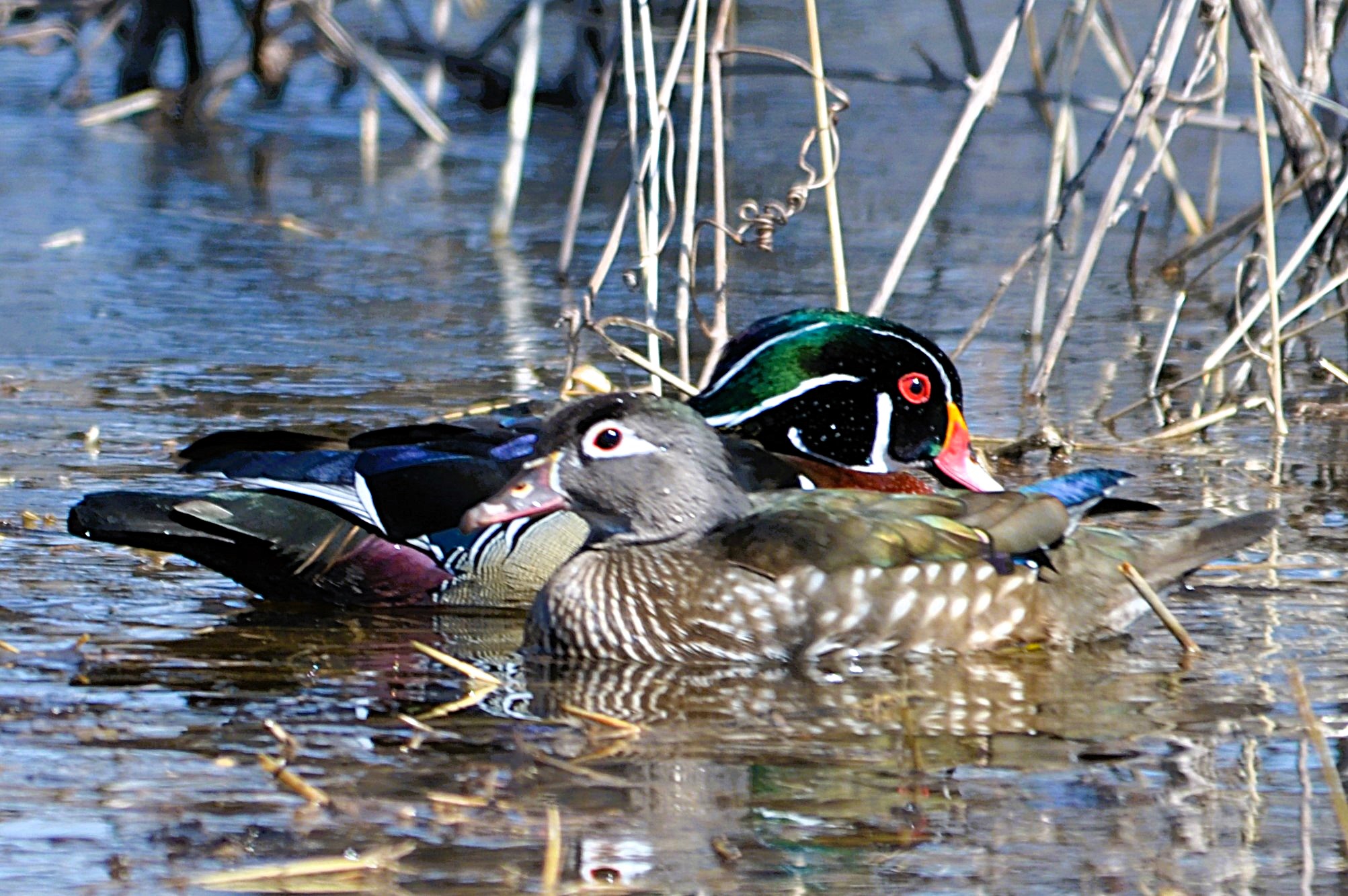 C’est le canard qui fait pousser des exclamations ! Le plumage nuptial du mâle avec ses motifs colorés est spectaculaire. On reconnaît madame branchu en raison de son anneau oculaire. Niche en hauteur. Habite les terres humides et les forêts inondées. Vole entre les arbres avec agilité.