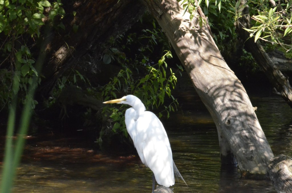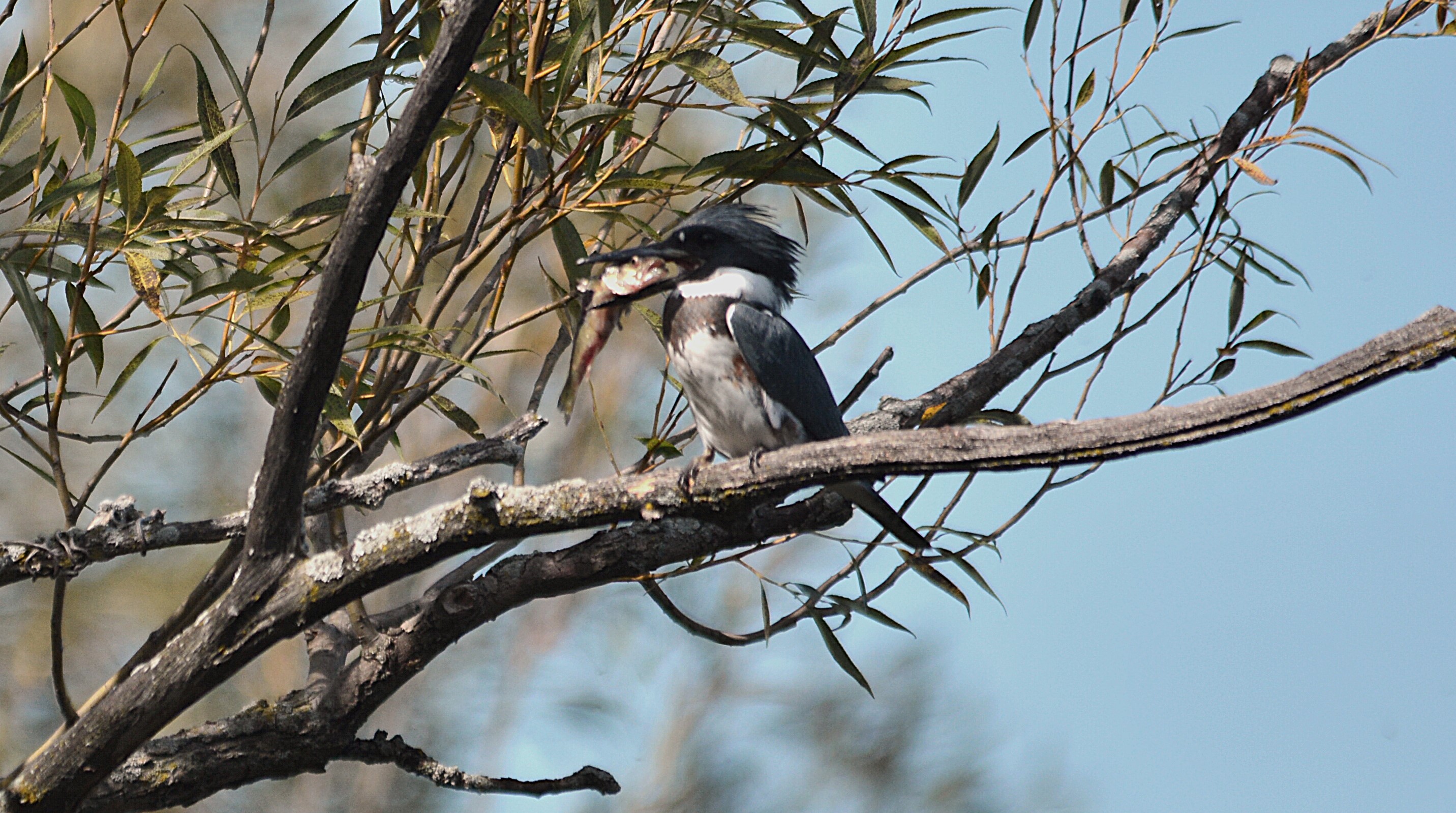 Une rafale de mitraillette ? Plutôt le son caractéristique du martin-pêcheur en vol. Il plonge tête première après avoir fait du surplace. Il ressort aussi vite de l’eau. Avec sa proie, il se dirige vers l’arbre de son choix. Sur l’arbre, il assomme son poisson avant de l’avaler. Avec de la chance il se pose suffisamment longtemps pour nous permettre de le photographier. Son dessus est bleu pastel, son dessous blanc avec une ceinture bleue à la poitrine. Cet oiseau se distingue par sa grosse tête, son long bec, et sa huppe ébouriffée. Presque toujours solitaire, il met de la vie autour de lui.