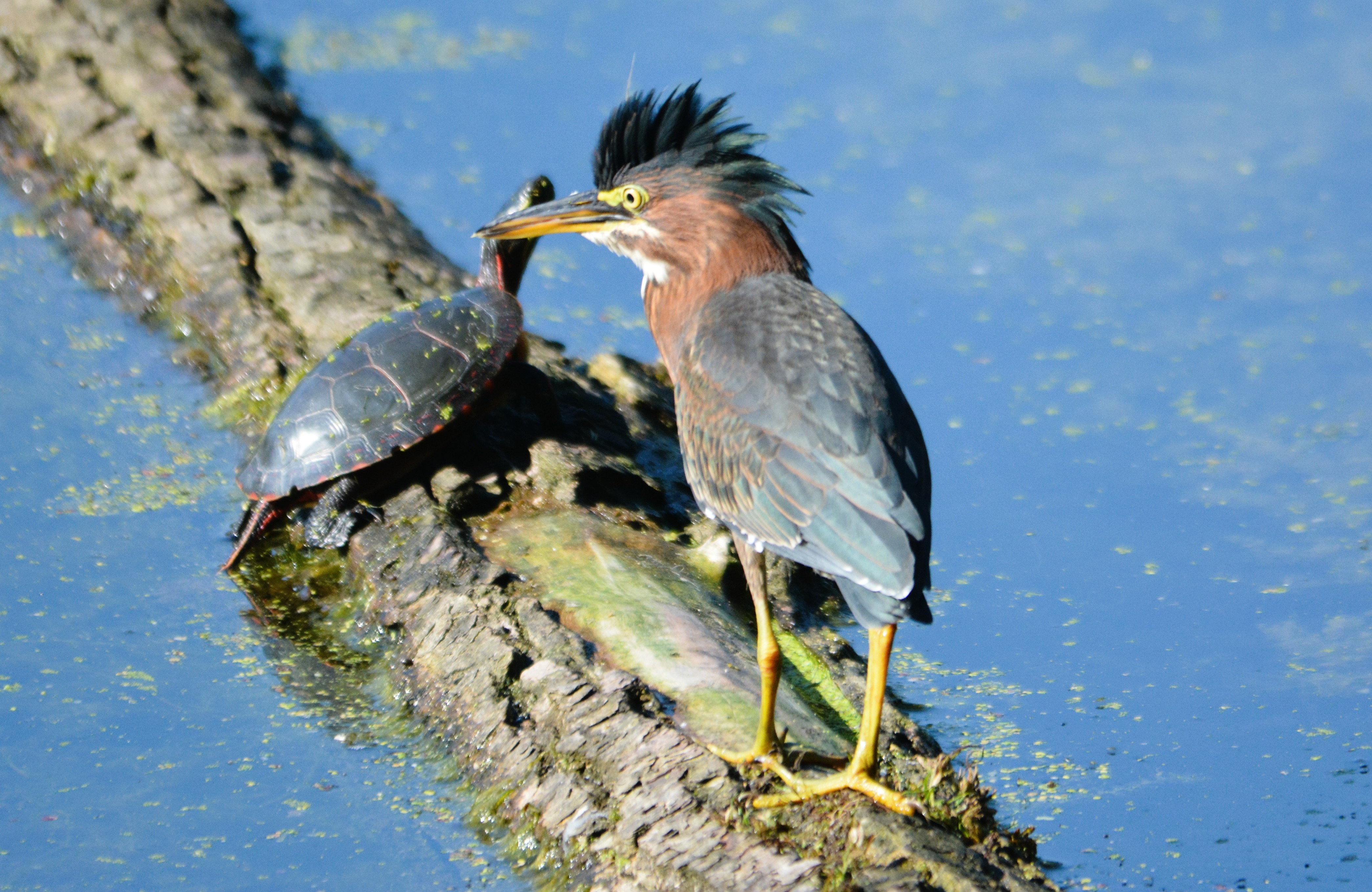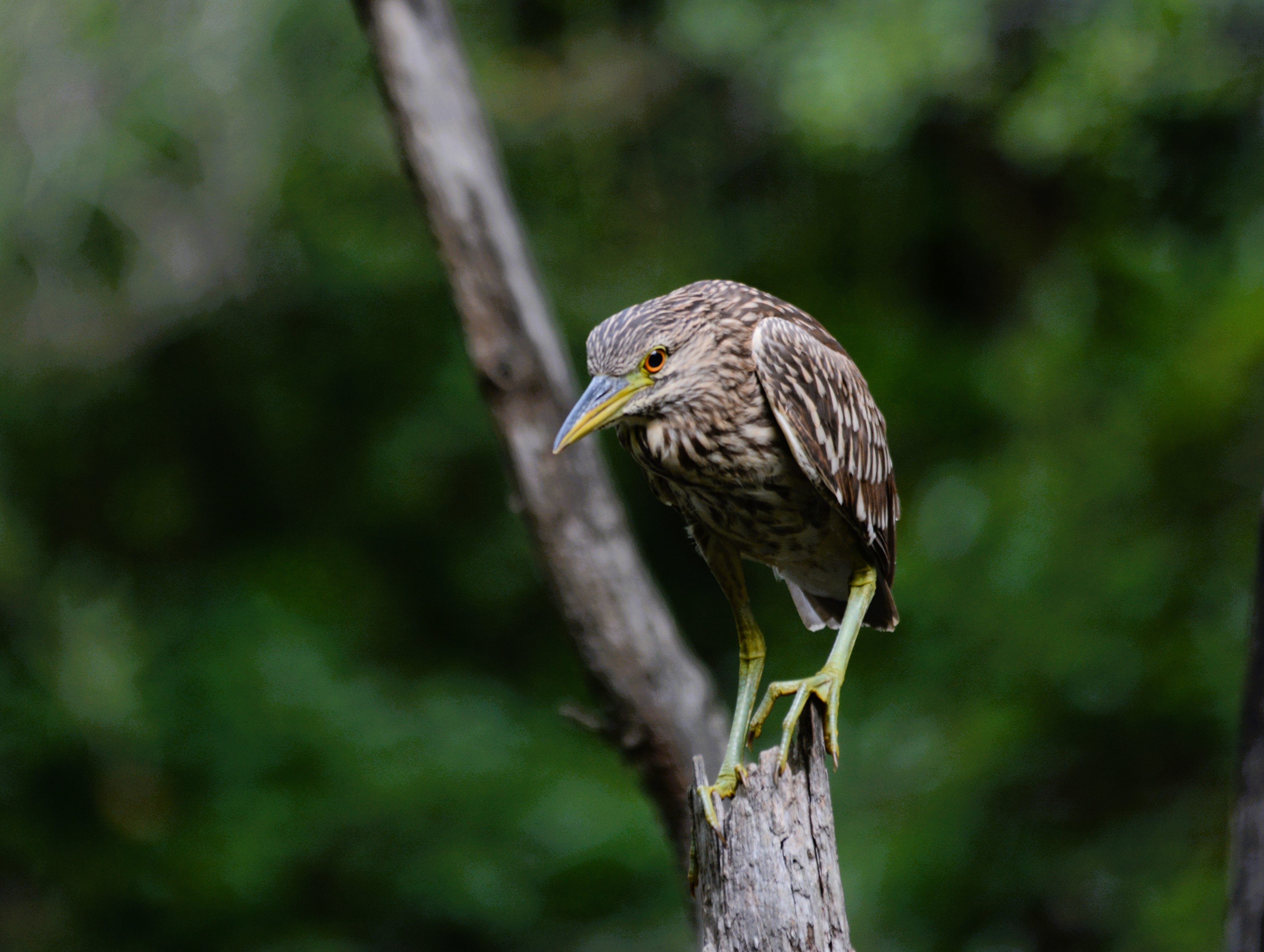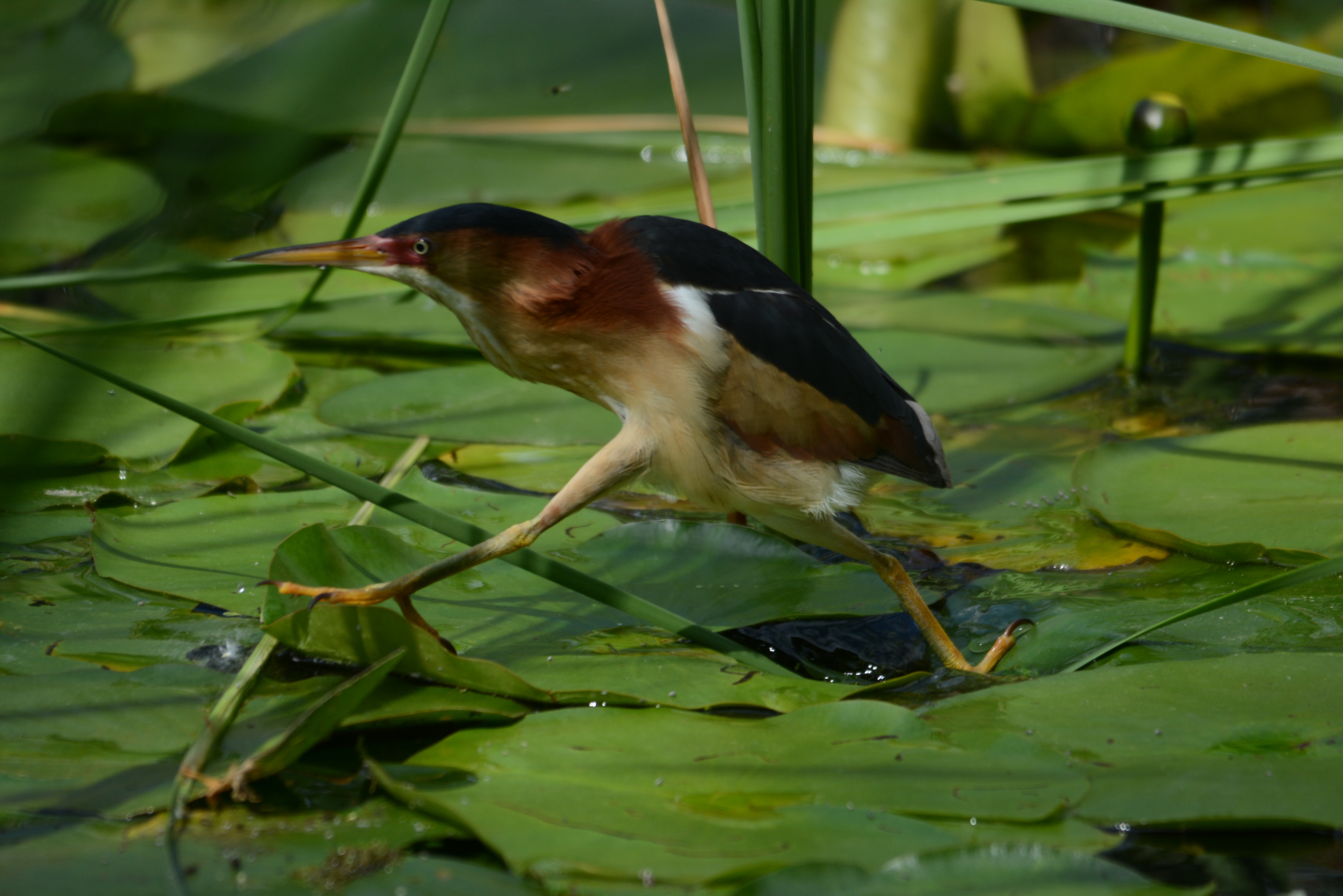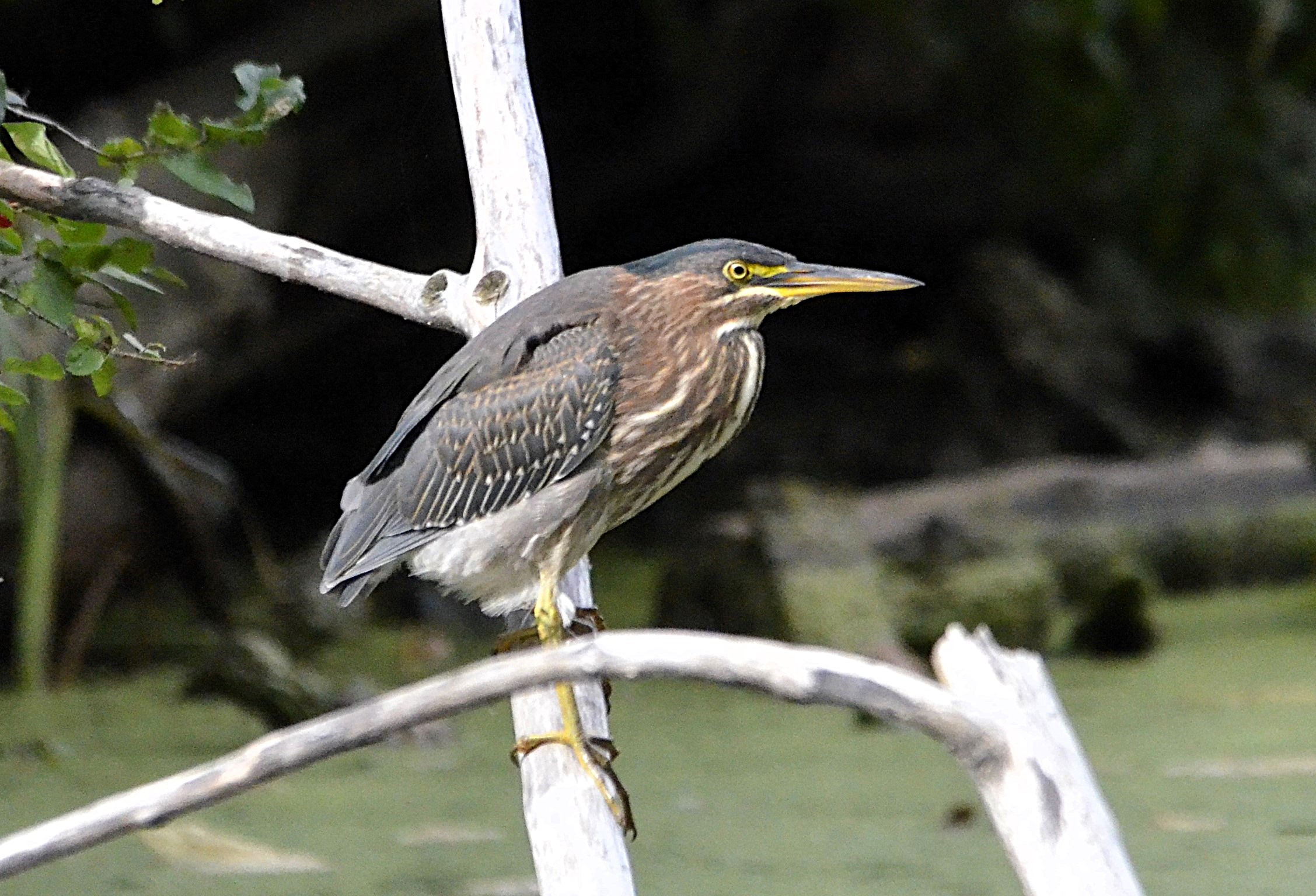 Un petit héron foncé avec le dos vert-bleu, cou rouillé et calotte foncée. Habituellement caché dans la végétation en attendant patiemment sa proie. Ma plus belle rencontre s’est produite au technoparc Saint-Laurent. C’était un face à face mémorable. Je me frayais un chemin dans la végétation autour du marais en toute fin de journée. Nous avons tous les deux figé. J’en ai oublié mes réglages. La photo a été quelconque, mais le souvenir mémorable.