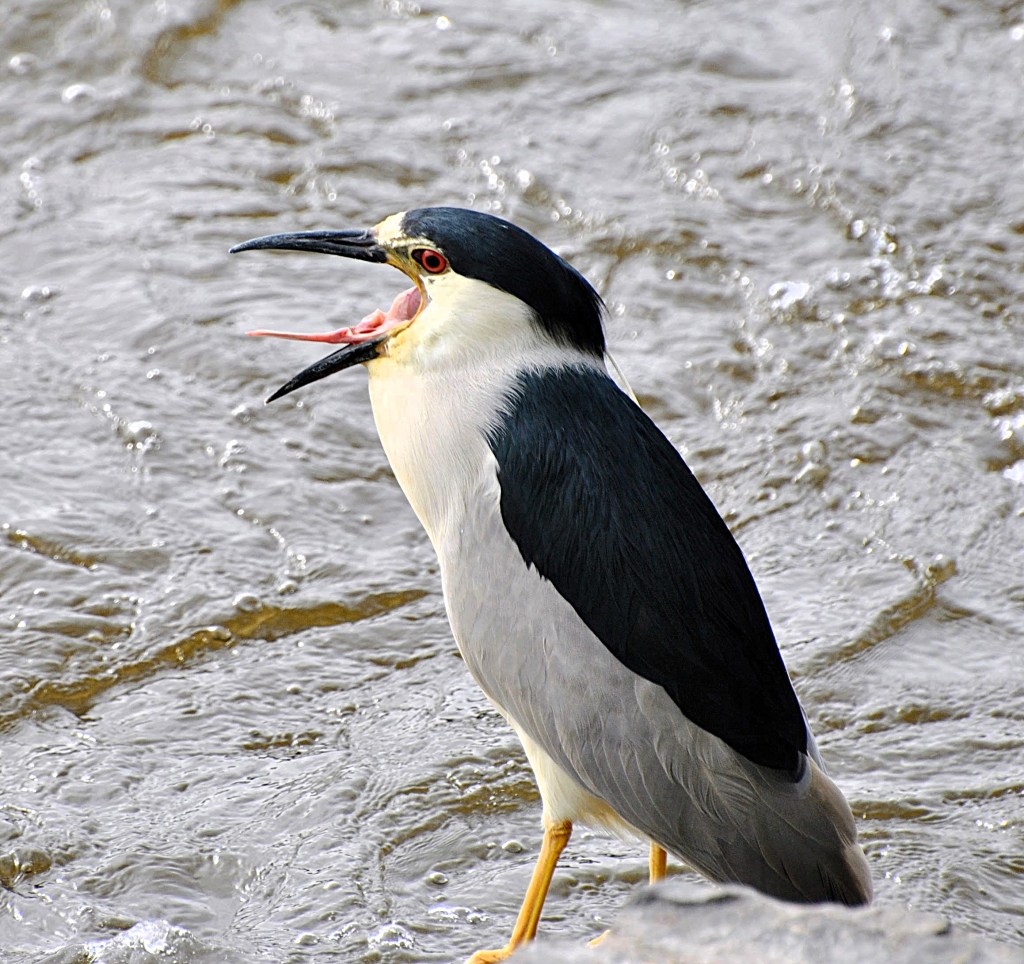 Un héron trapu avec le cou habituellement rentré. Les adultes ont un plumage grisâtre pâle avec une calotte et dos noirs. Leurs yeux sont rouges. Les juvéniles sont différents, bruns et striés avec des yeux jaunes. Le bihoreau peut rester très longtemps immobile au même endroit dans l’espoir d’attraper un poisson qui passe à sa hauteur.