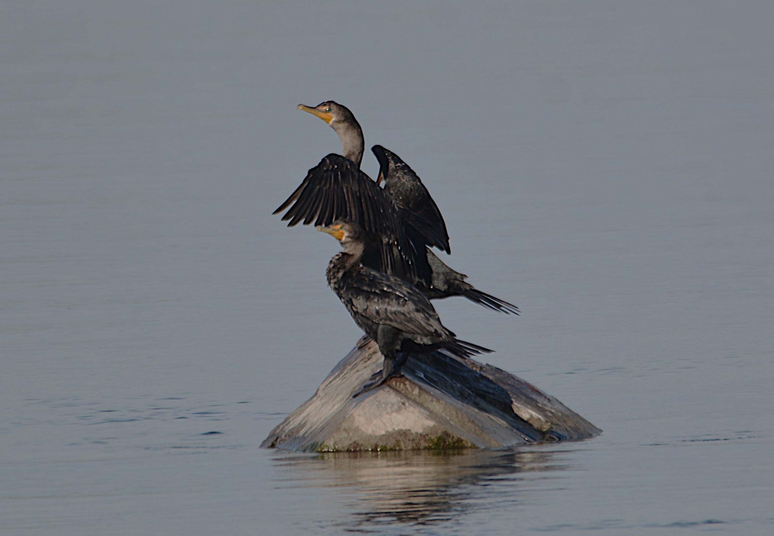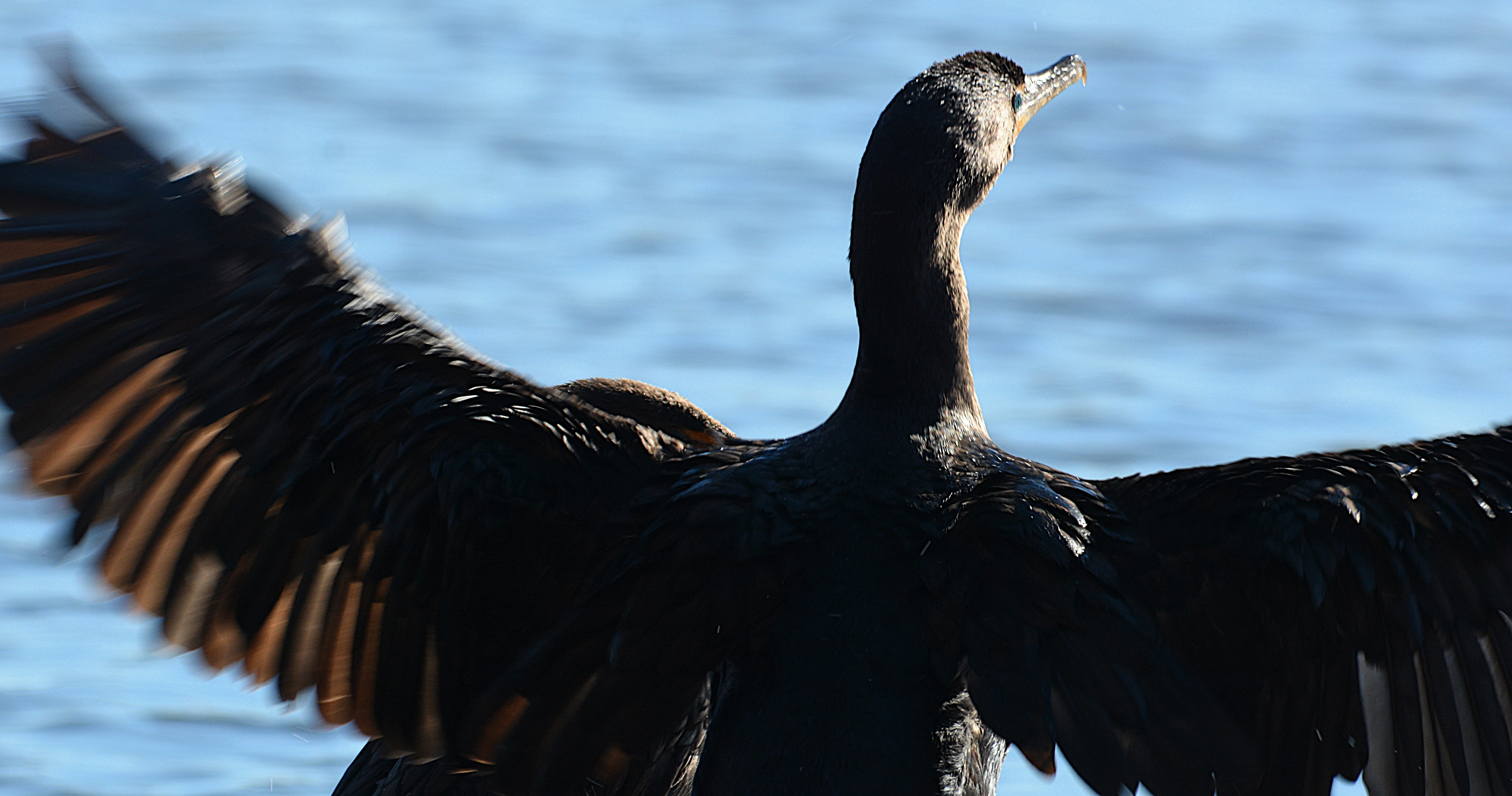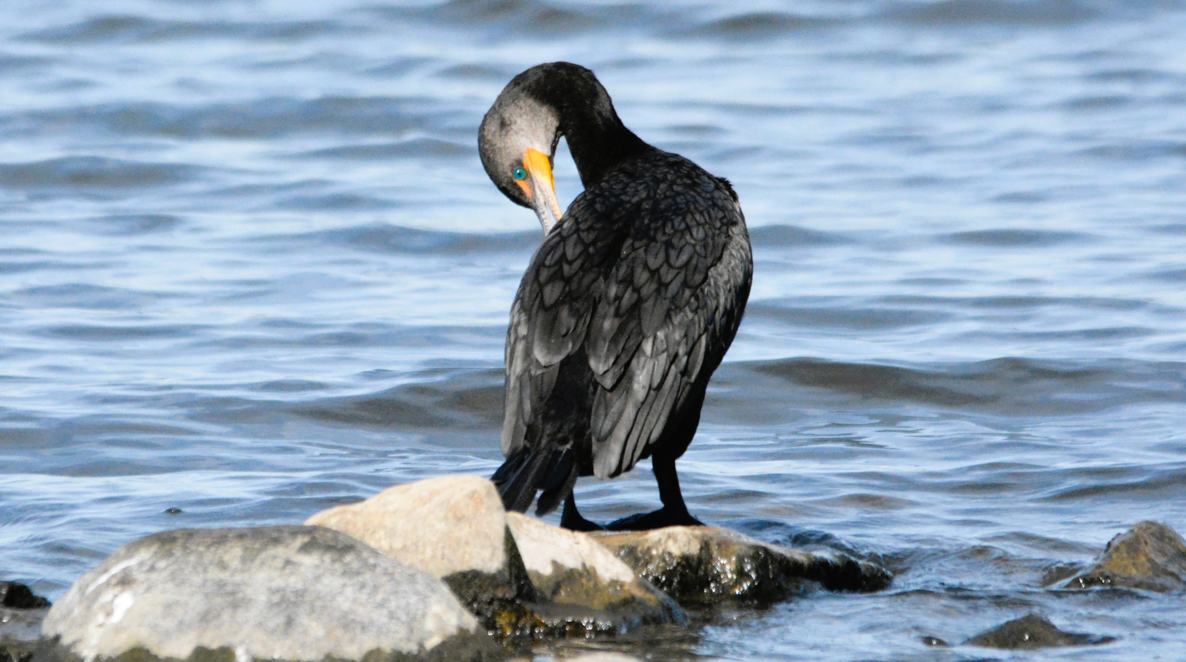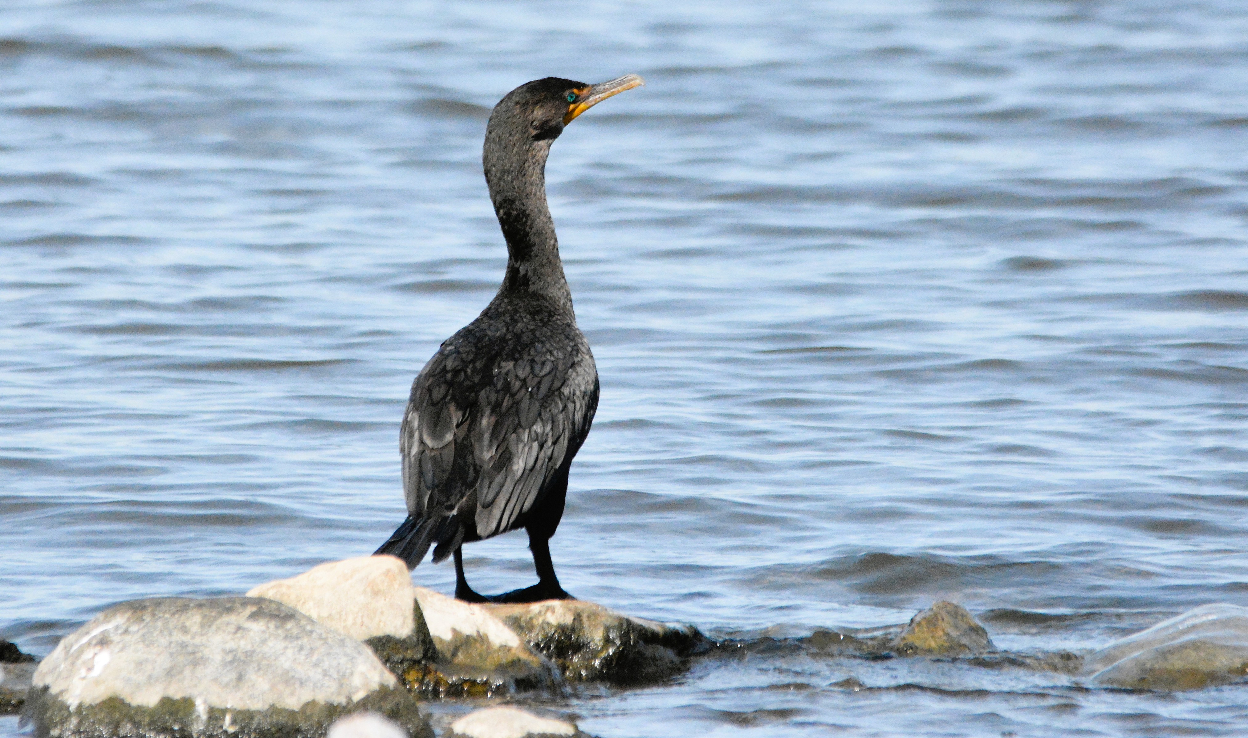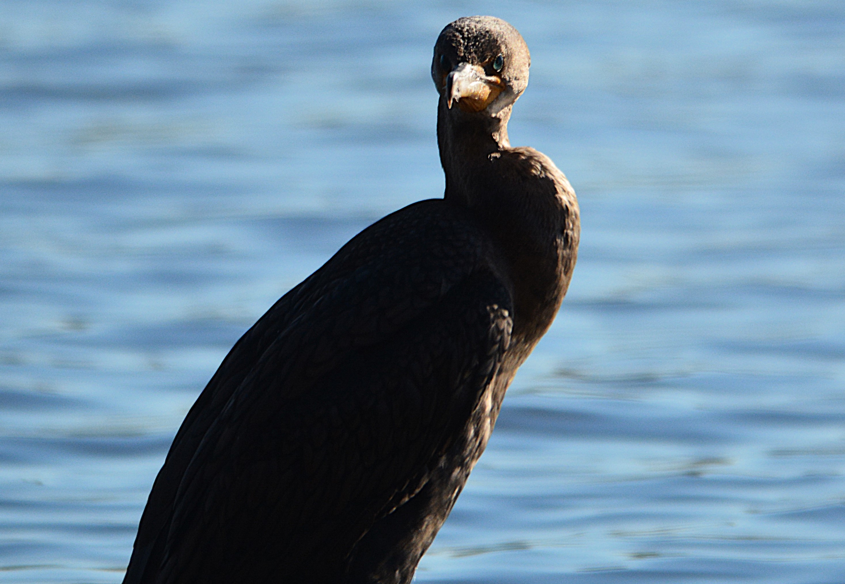 Corps foncé. Peau nue orange à la base du bec. Surtout, un oeil bleu-vert qui oscille du turquoise à l’émeraude. Il n’est pas particulièrement beau. Il ressemble à un épouvantail parce qu’il doit étendre ses ailes pour faire sécher ses plumes. Il plonge pour attraper les poissons.