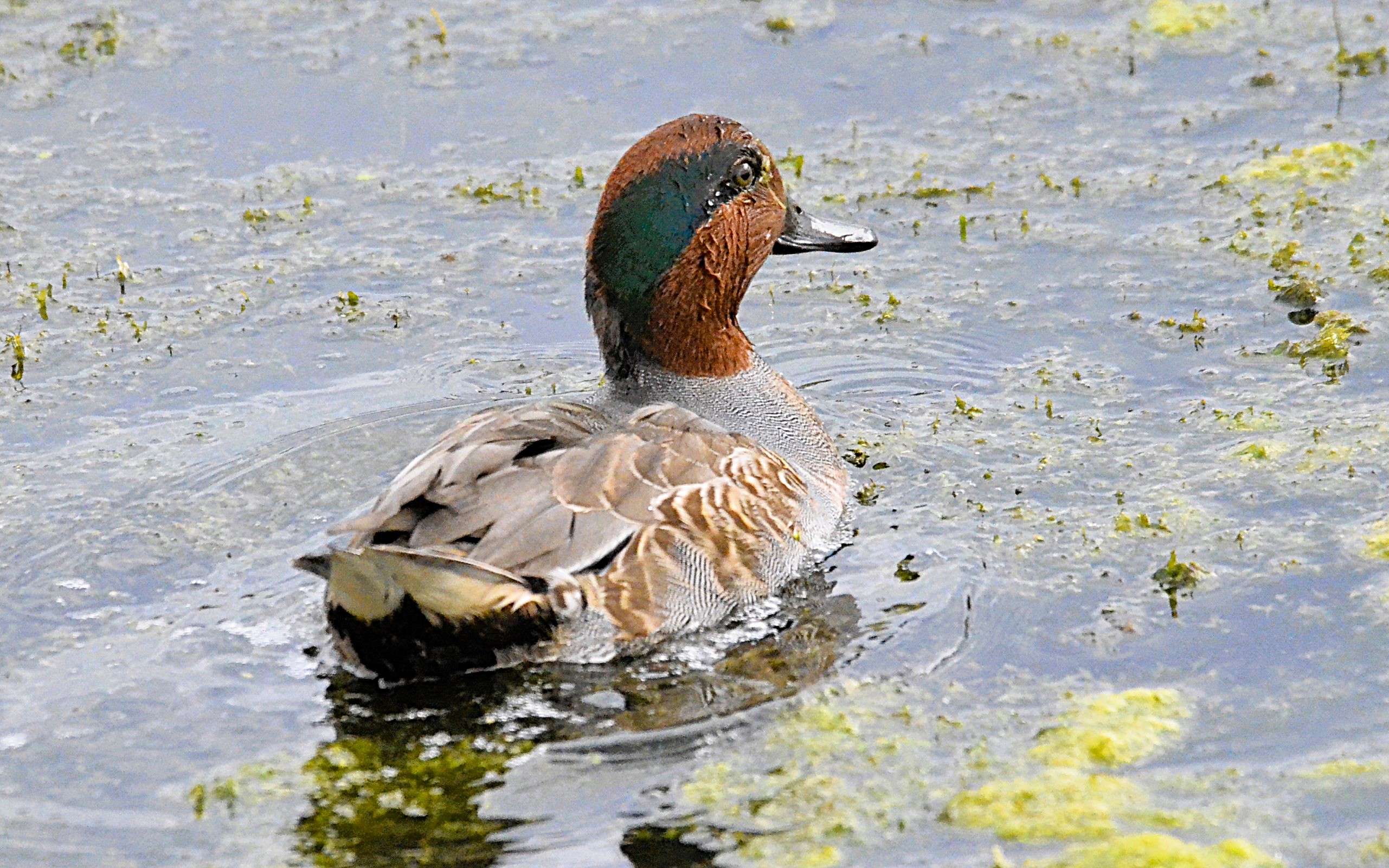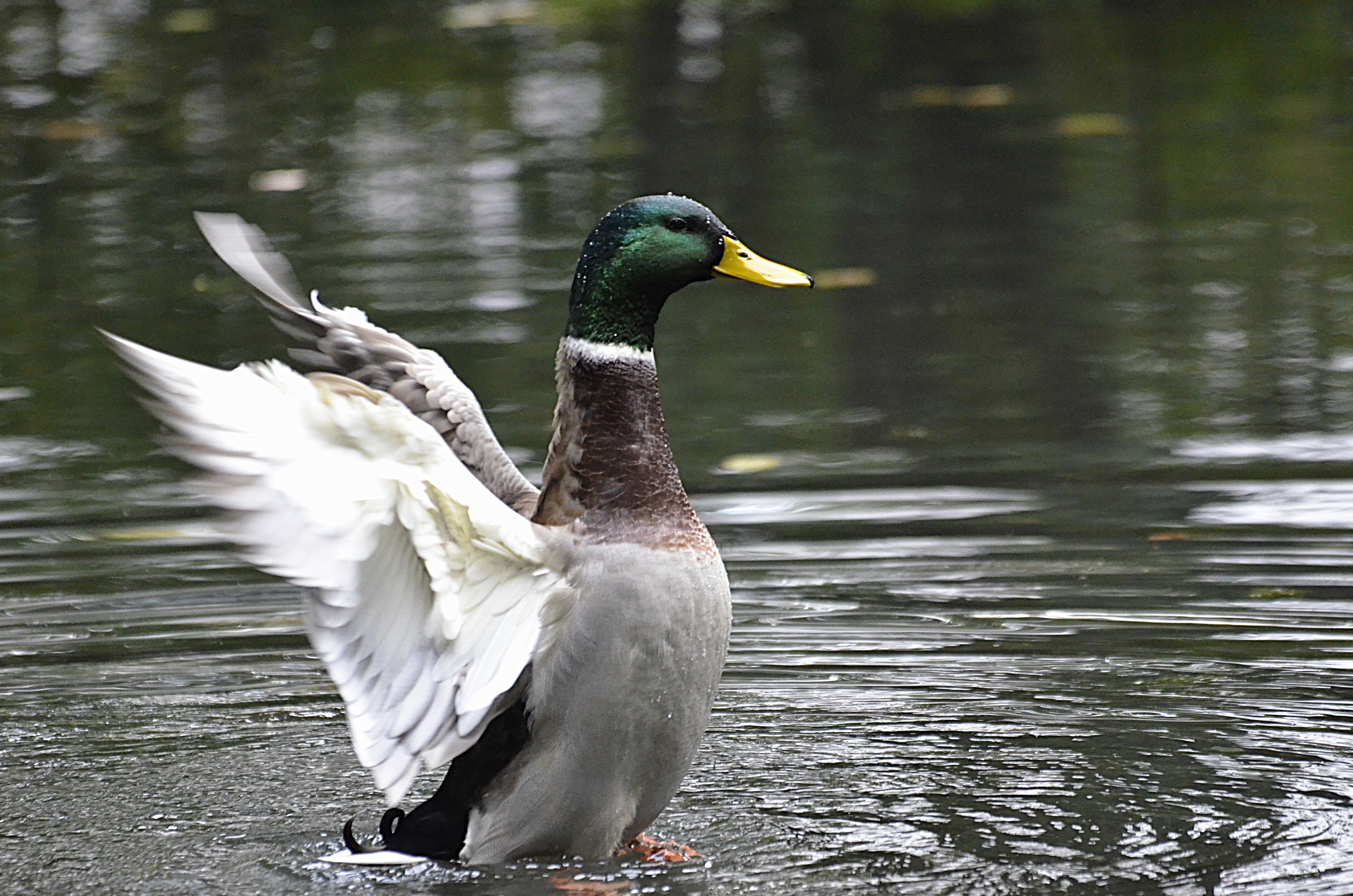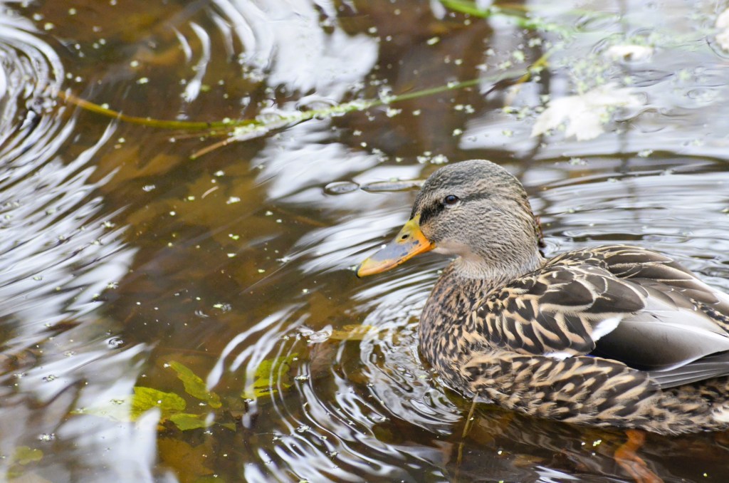On le voir partout et tout le temps : dans les parcs, les ruisseaux et les habitats humides. Le mâle a la tête verte. La femelle est brun tacheté. Elle a un bec orange avec de grosses taches noires.