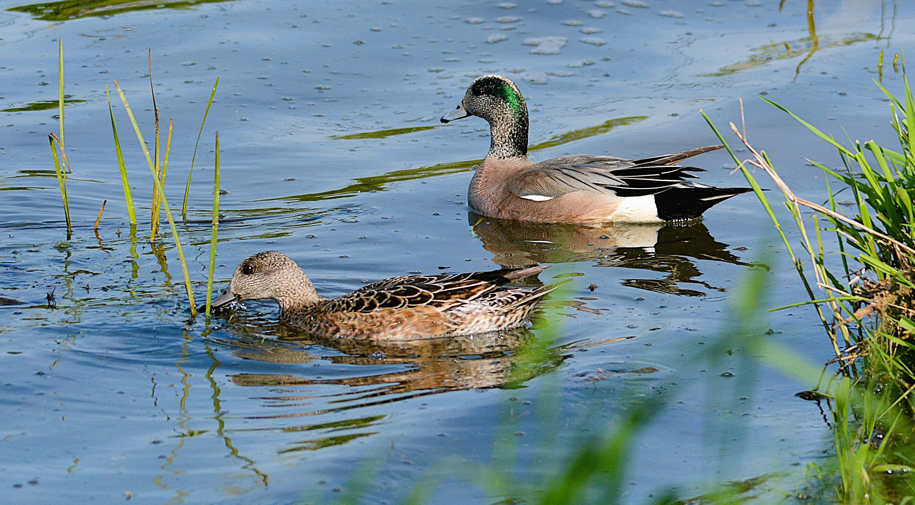 Le mâle a une plaque blanche très visible sur le front et une large bande verte derrière l’oeil. Chez la femelle il faut chercher à voir les flancs tirant sur l’orange. Cet oiseau est aussi enclin à brouter sur la terre ferme qu’à barboter dans l’eau.
