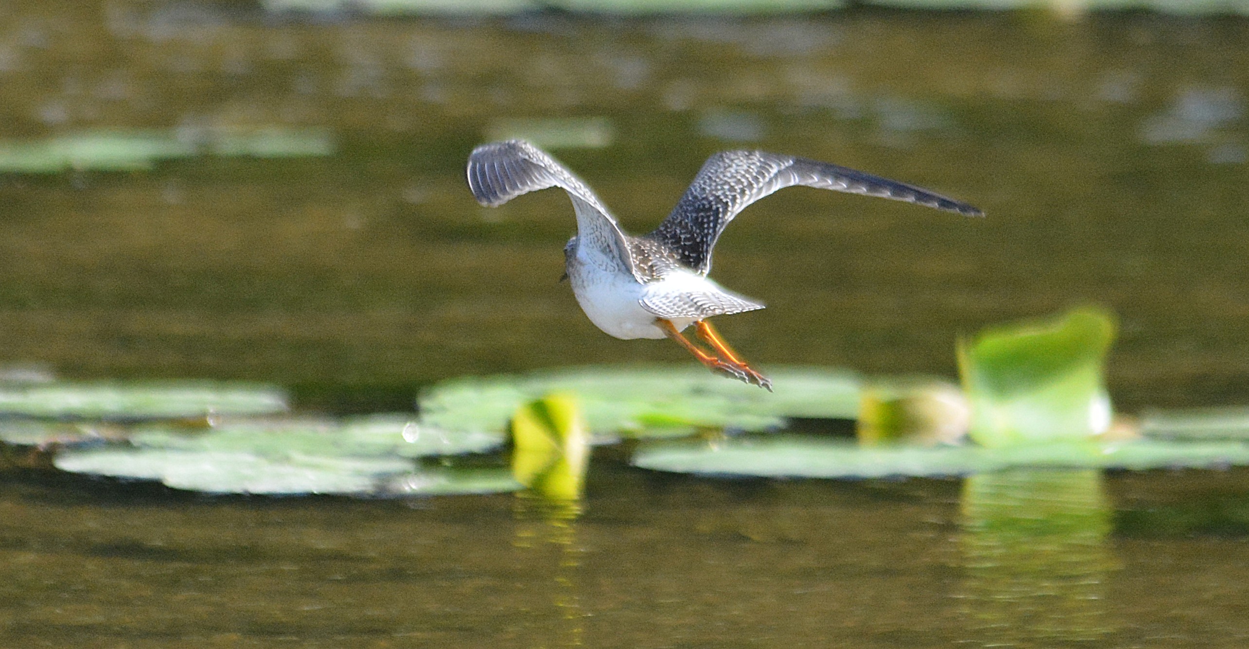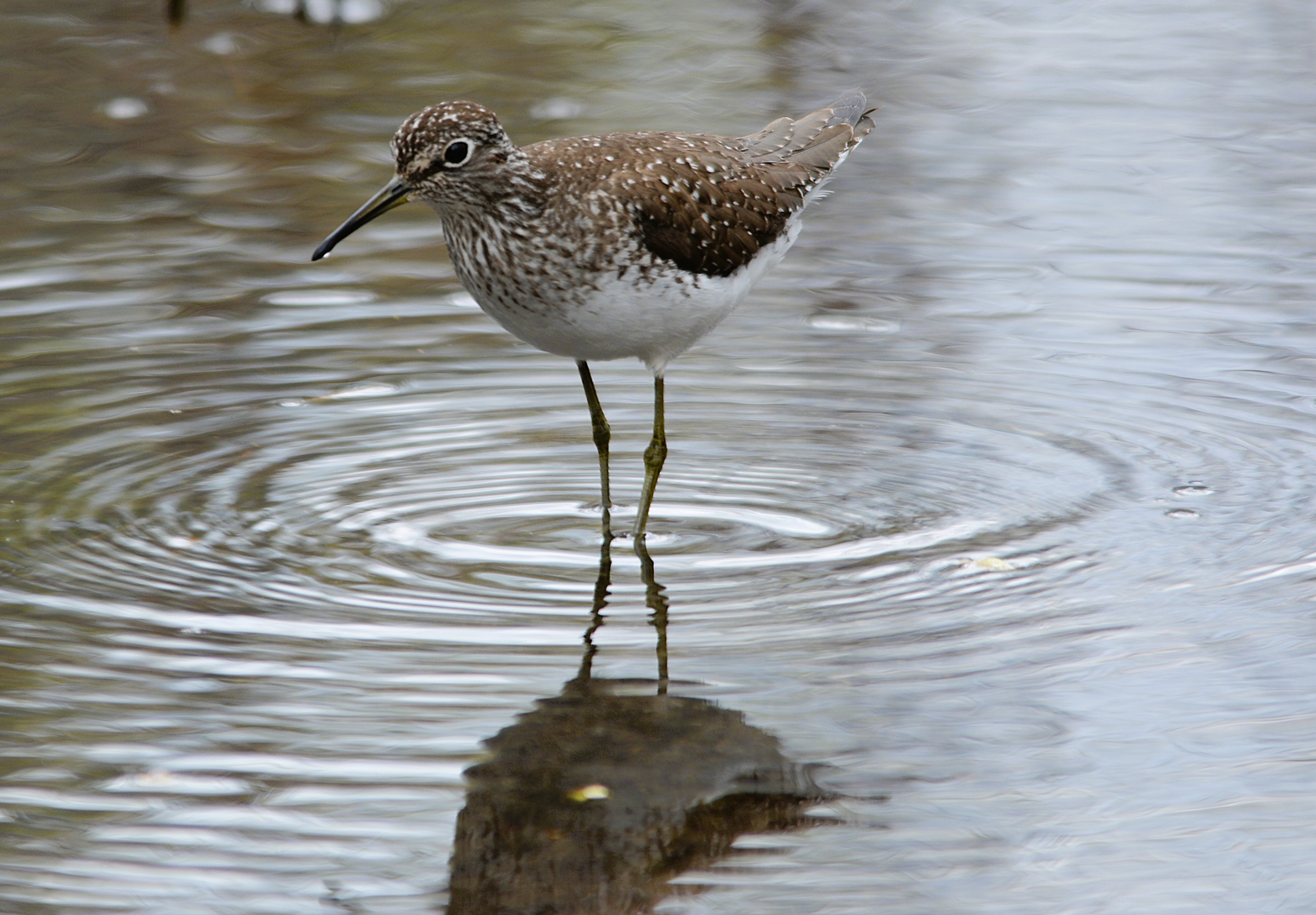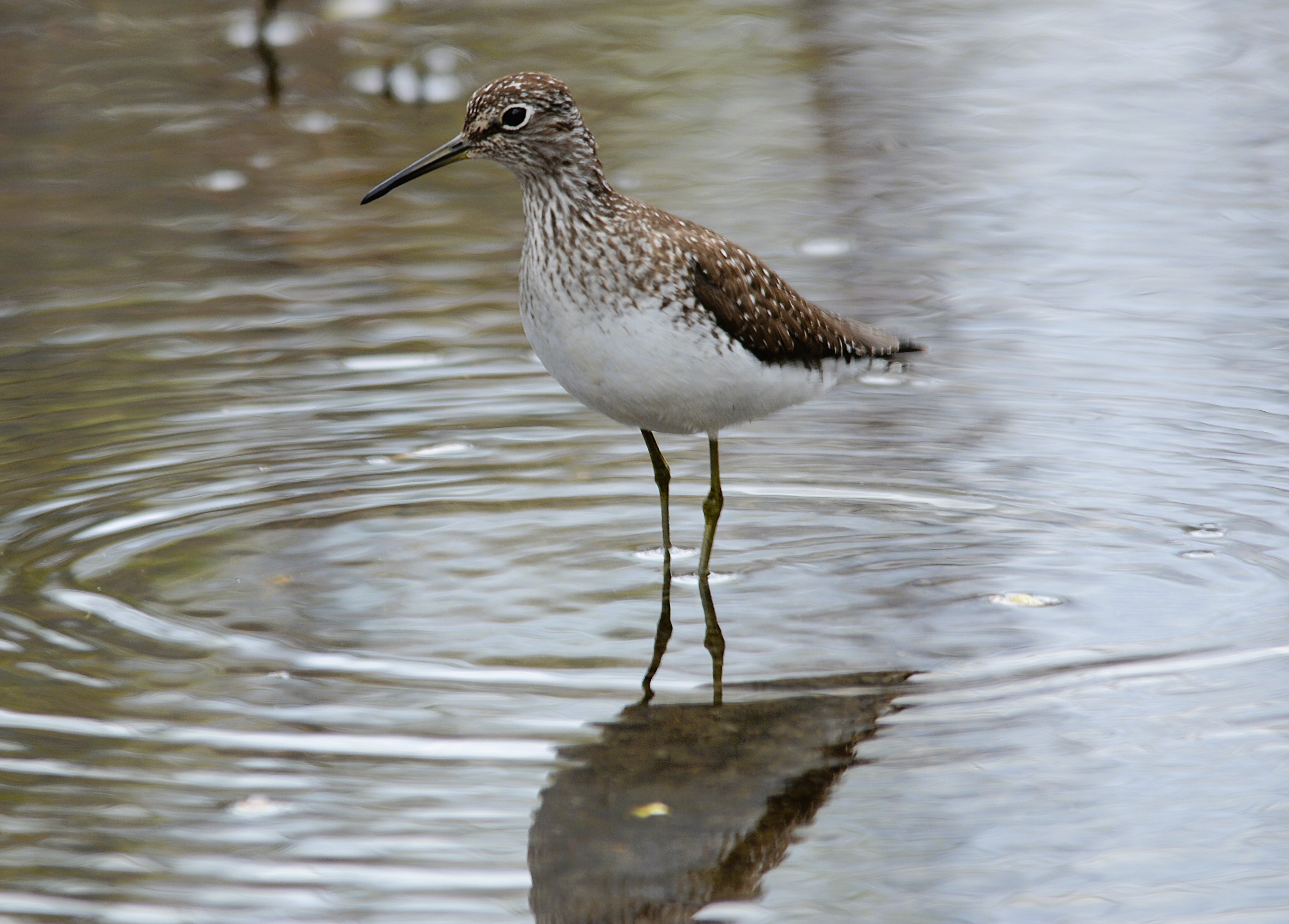 Souvent seul. Plus petit que le petit chevalier. Ses pattes sont plus vertes. Le dessus est gris alors que le dessous est blanc. Il a habituellement une lunette blanche distinctive. Il balance le corps comme le chevalier grivelé, mais moins rapidement et de façon moins exagérée. La migration printanière est courte et rapide.