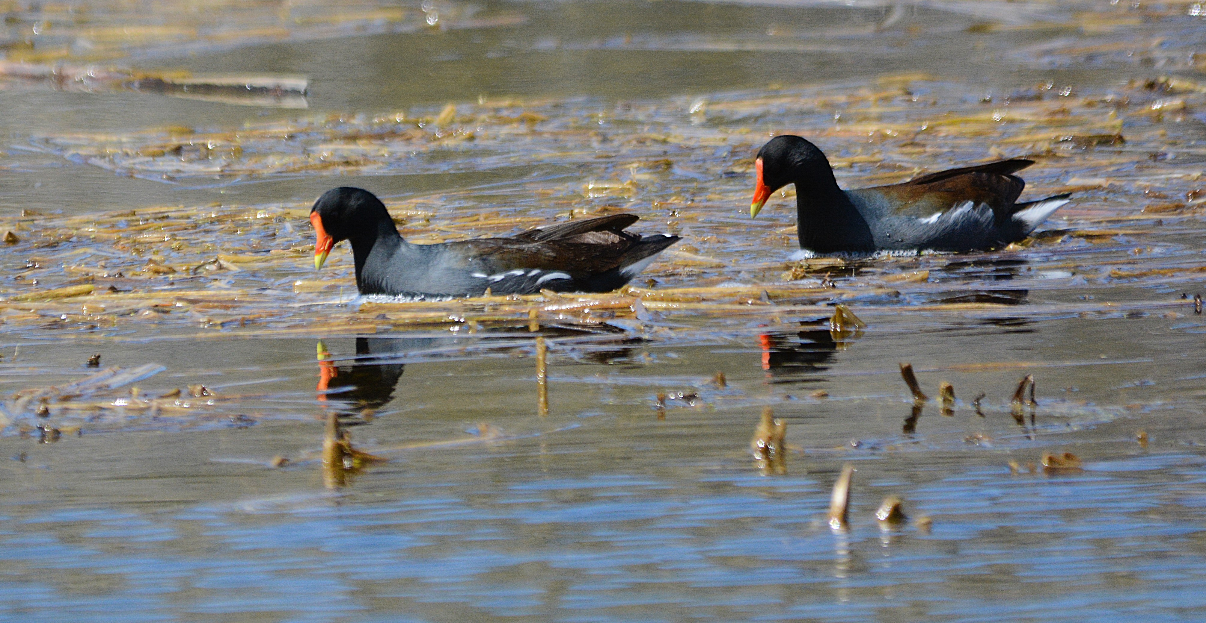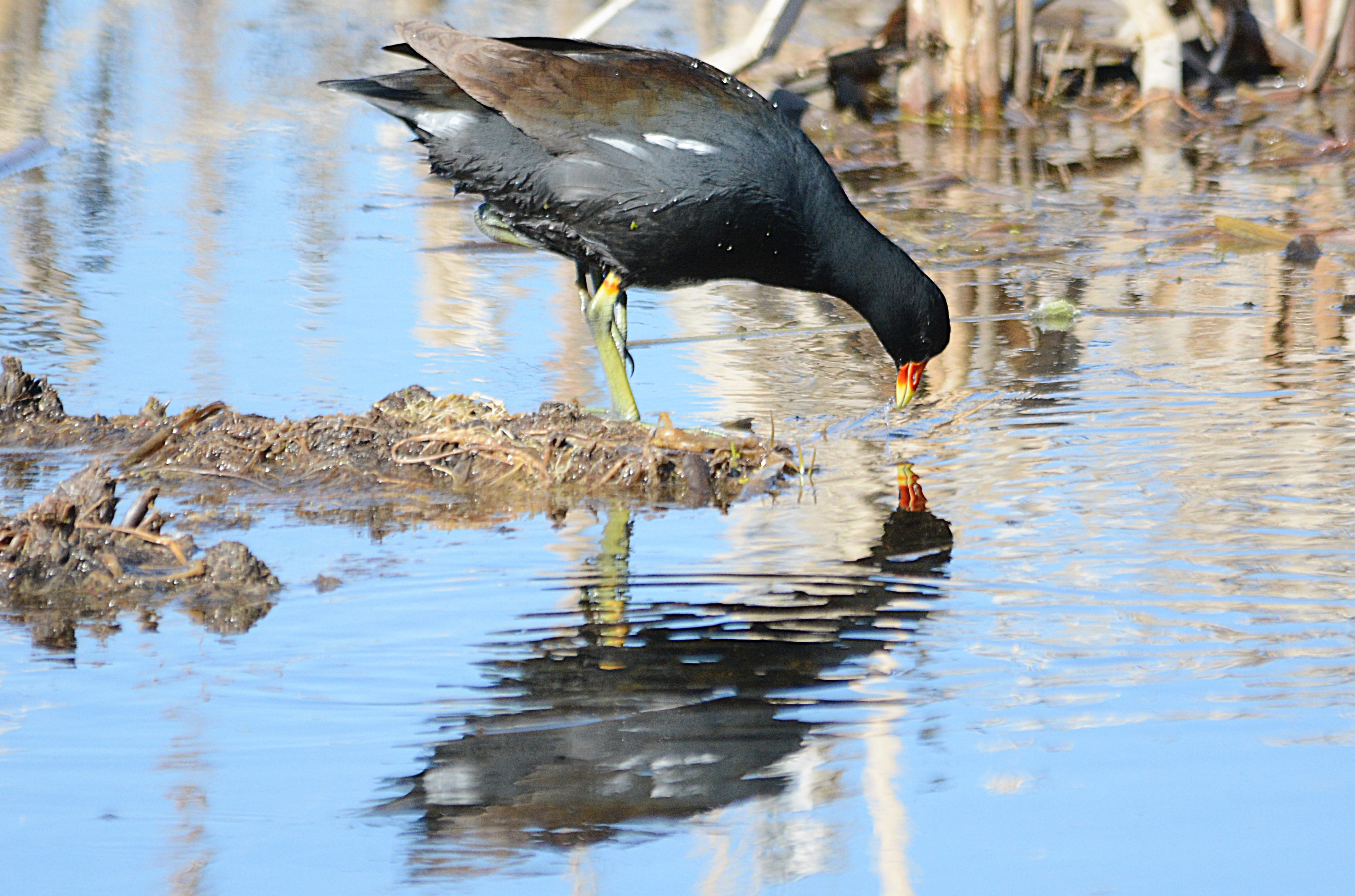 On l’appelle aussi la poule d’eau. Cet oiseau des marais est souvent observé près des quenouilles, jamais loin de l’eau. L’adulte a un bec rouge vif avec une pointe jaune. Une fine rayure blanche se trouve sur le flanc. Il y a aussi un peu de blanc sous la queue.