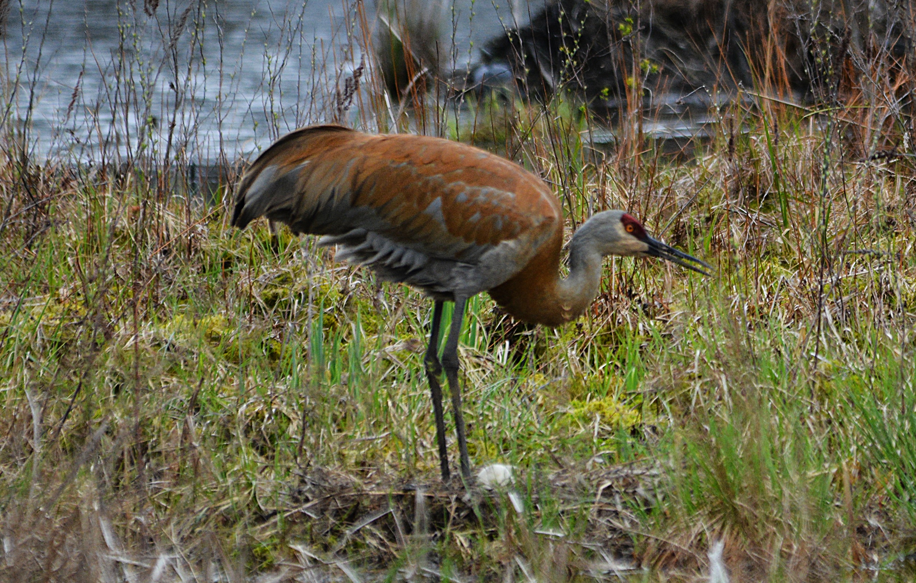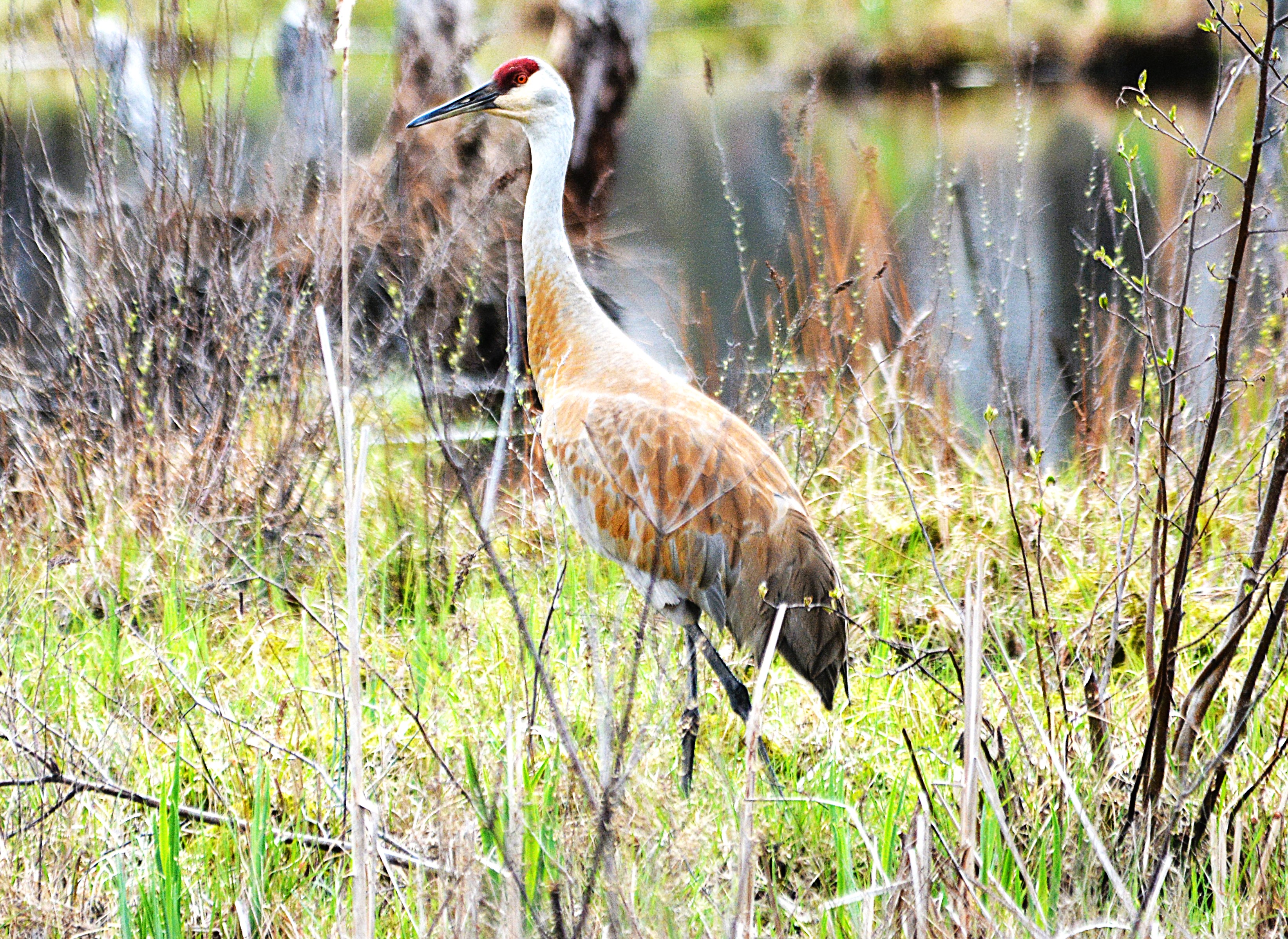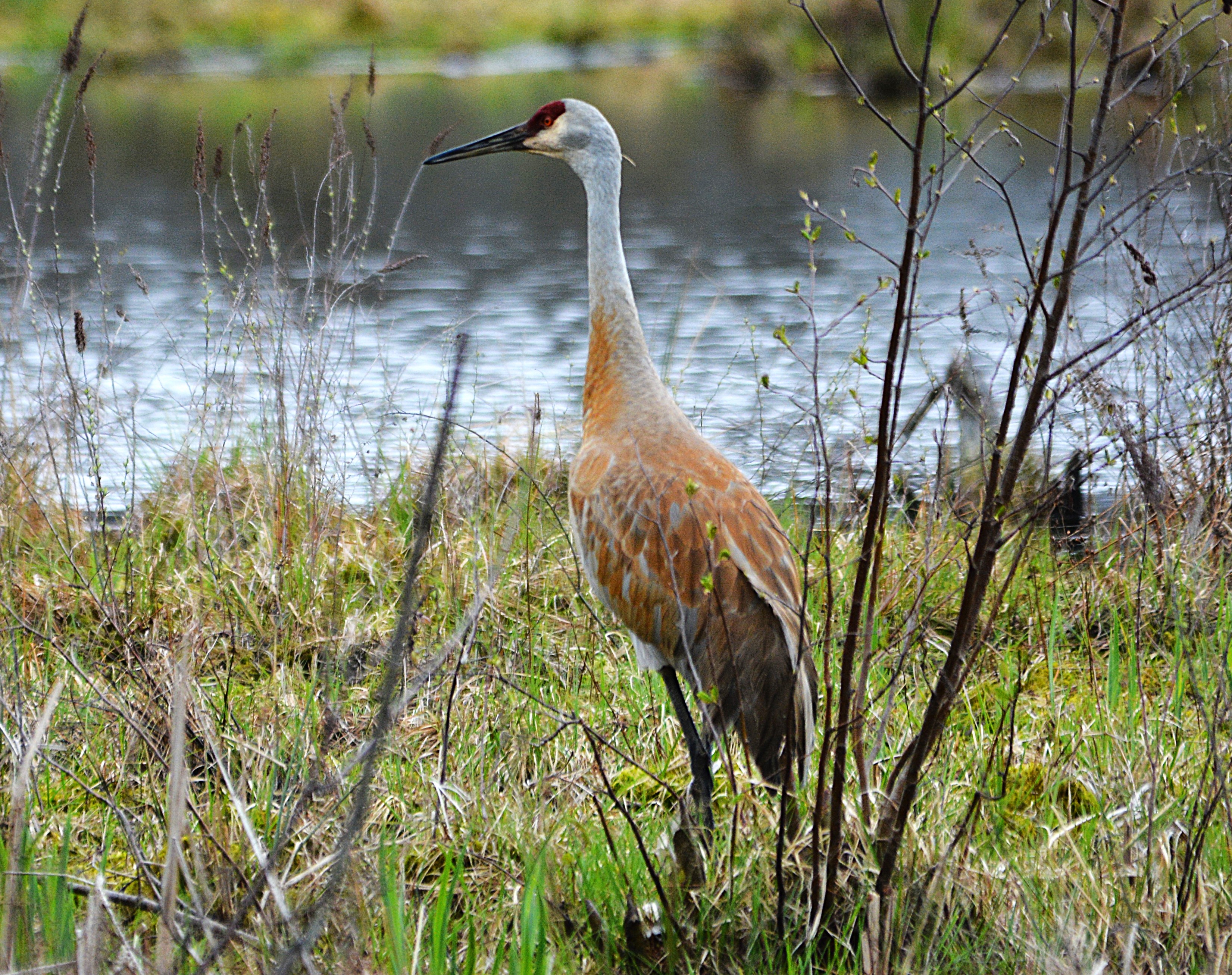 Oiseau très élancé sensiblement de même forme et de même taille que le grand héron. Le corps est principalement gris et l’adulte a une tache rouge vif sur le front de même que les joues blanches. Le bec est très fort. Les pattes sont longues et grises. Les deux sexes sont semblables. La grue du Canada vit près des marais et au bord de l’eau.